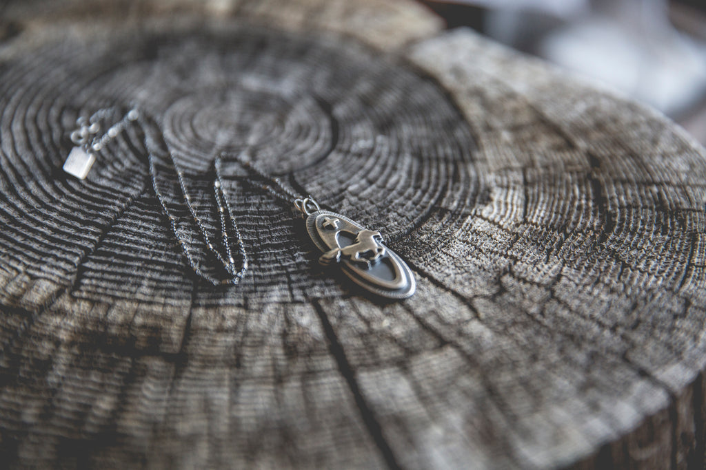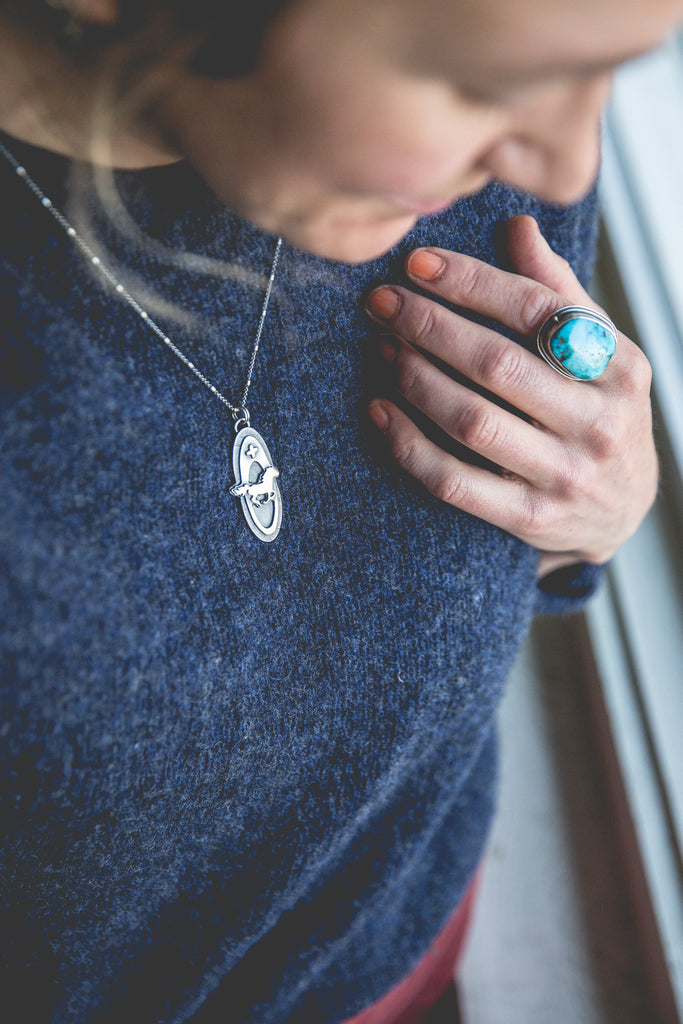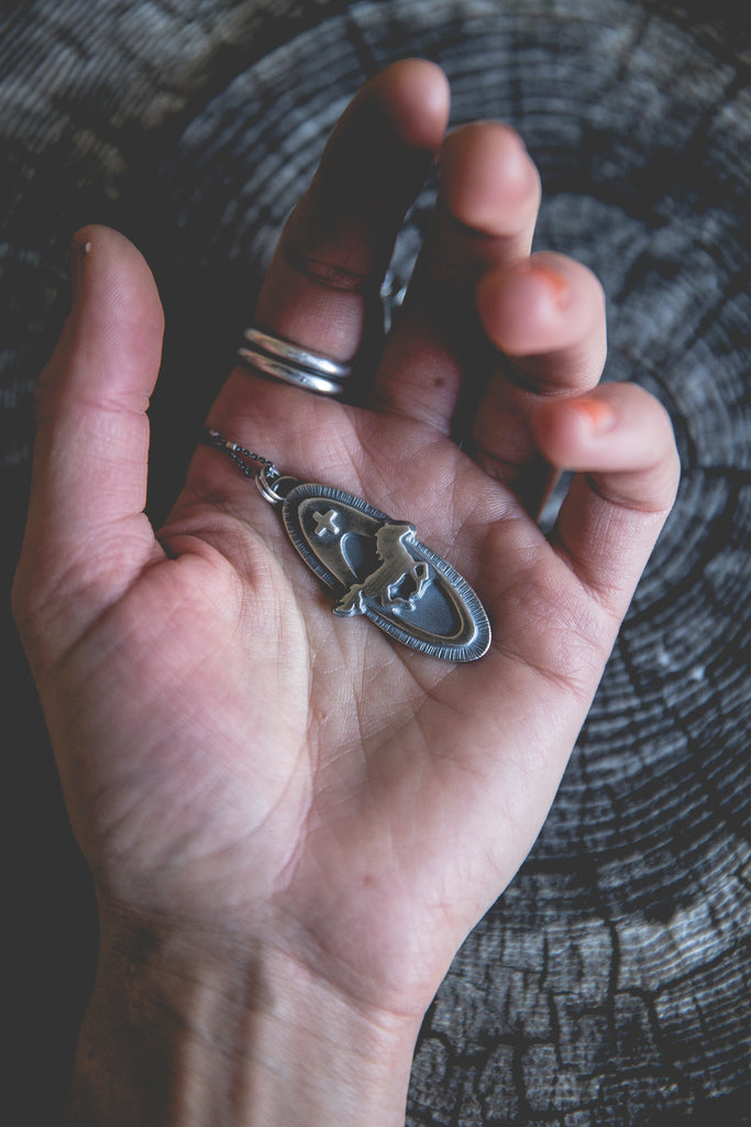 Here is that wonderful horse of mine depicted in deeply layered and textured heavy gauge sterling silver and strung on delicate but sturdy beaded chain -- for any gal who ever loved the beautiful things with four fast hooves.