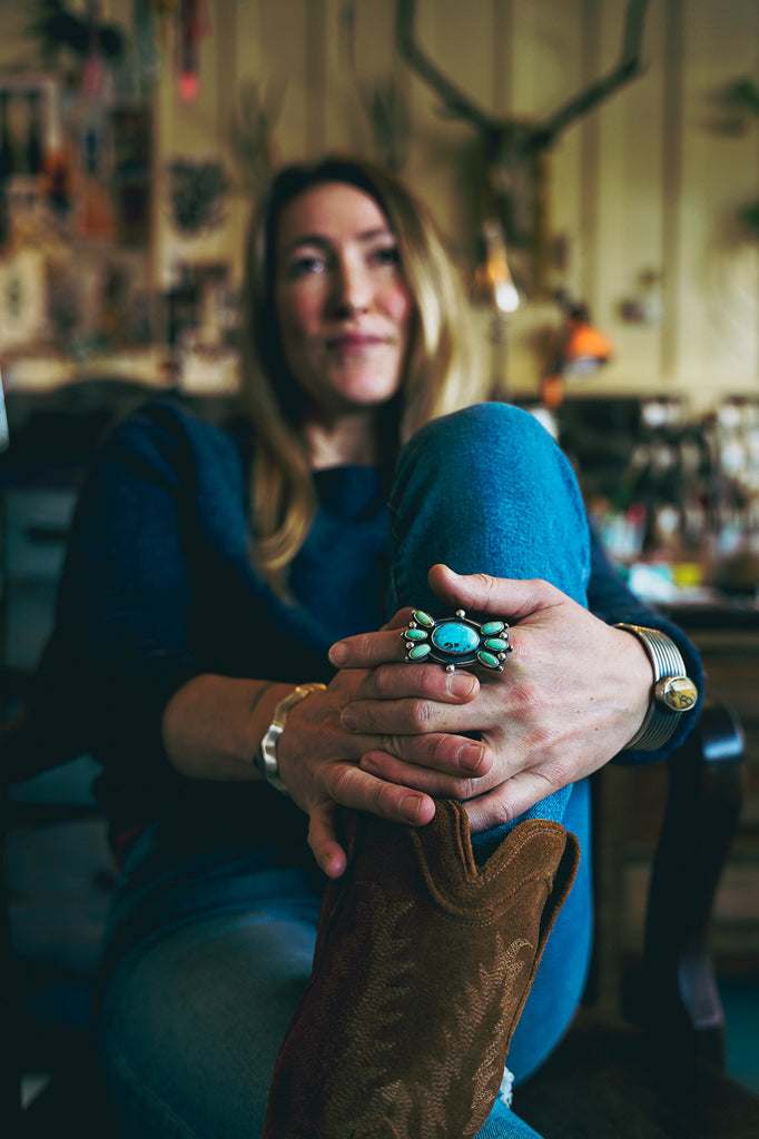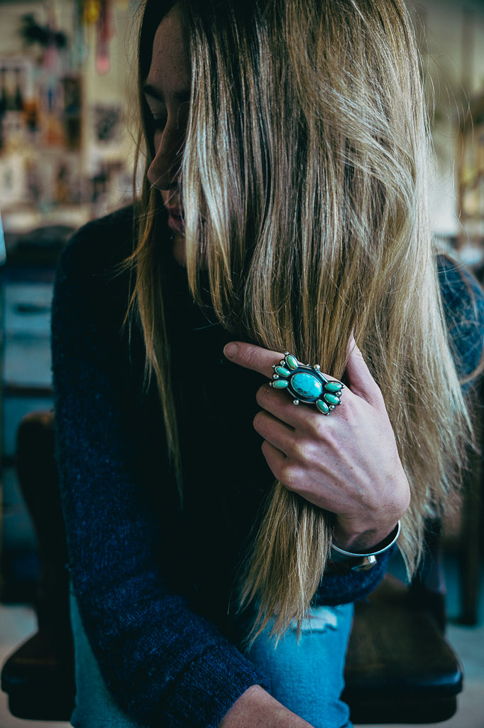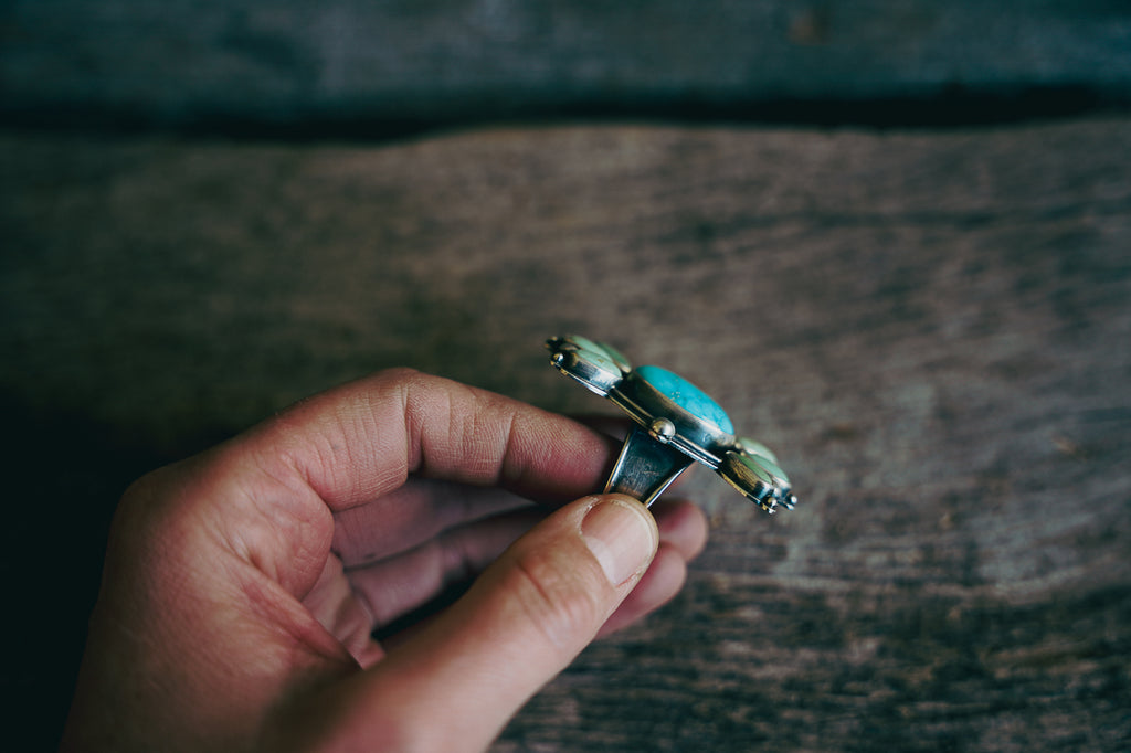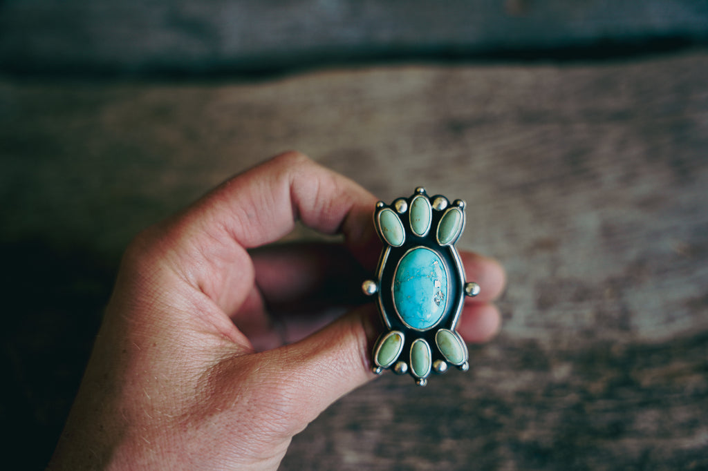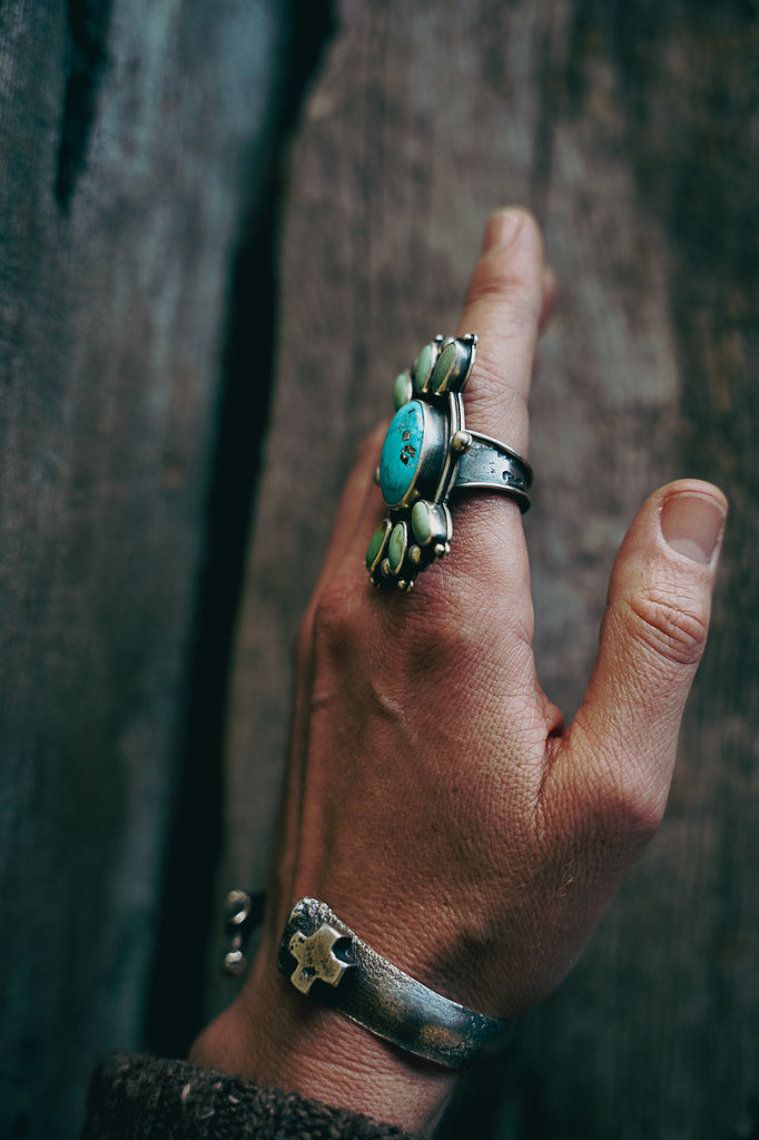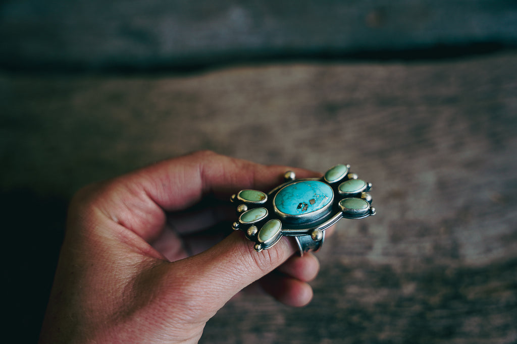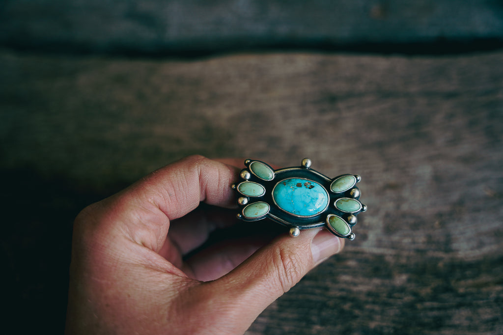 Plenty of Kingman turquoise here in sage green and bright blue with flecks of pyrite -- arranged in a classic butterfly shape that's pretty timeless. This piece was fun to build and it's also fun to wear. I especially like it paired with a nice set of boots and some tight fittin' jeans.