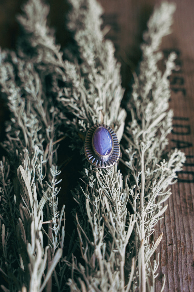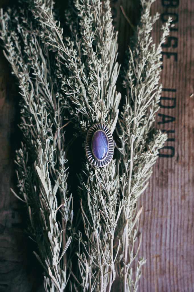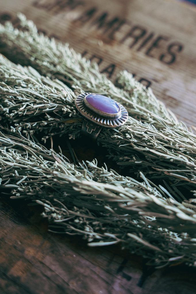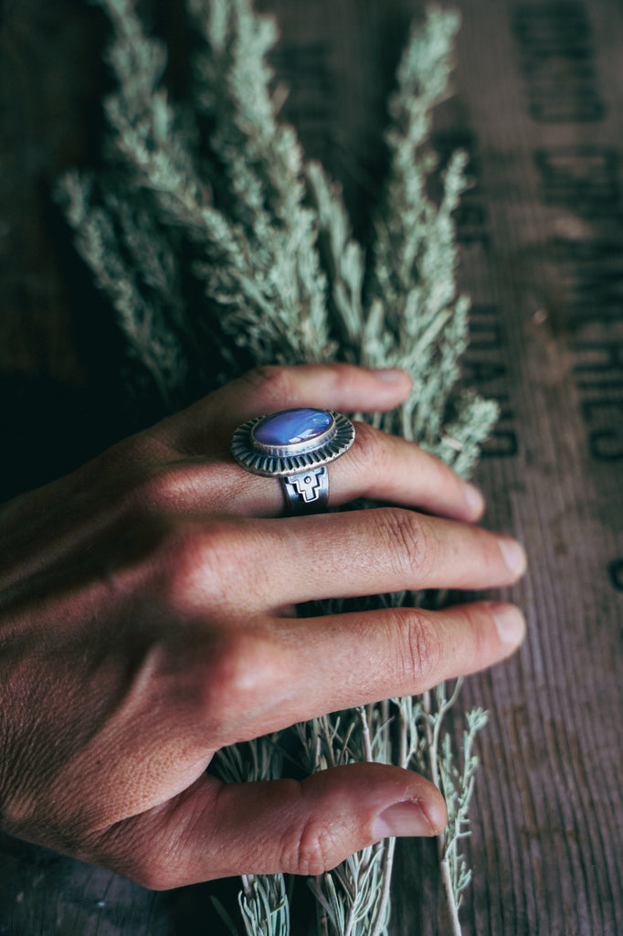 This ring is all about texture and dimension -- layers of heavy, textured sterling makes a nice home for a truly lovely slice of Holly Blue. The band bears a deep stamped appliqué depicting the sun setting in a canyon.