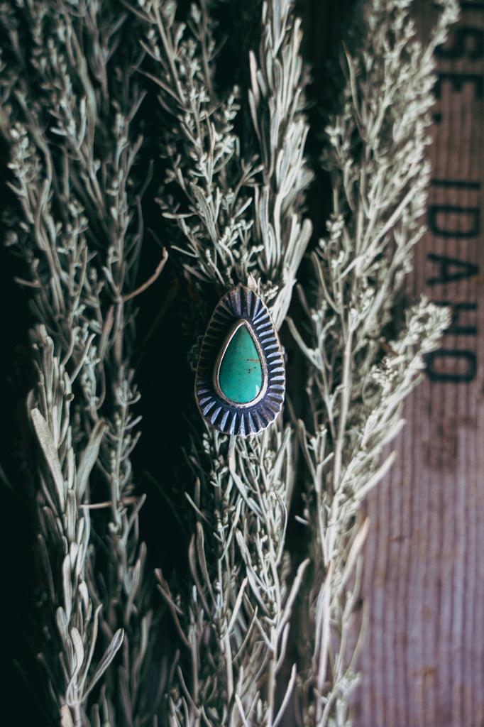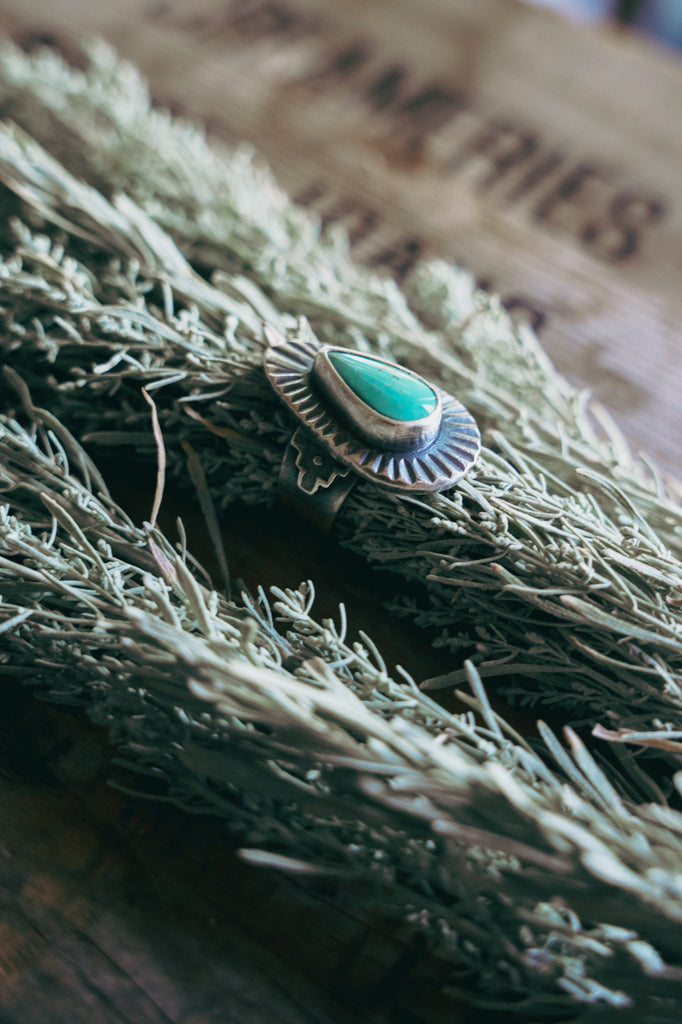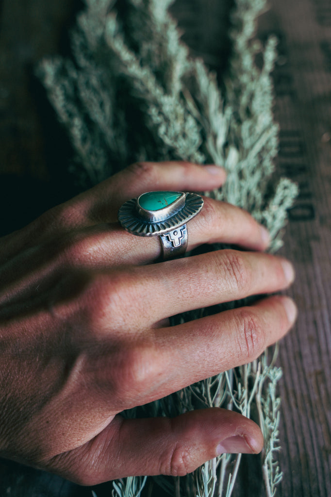 This ring is all about texture and dimension -- layers of heavy, textured sterling makes a nice home for a sizable teardrop cut of Kingman turquoise. The band bears a deep stamped appliqué depicting the sun setting in a canyon.