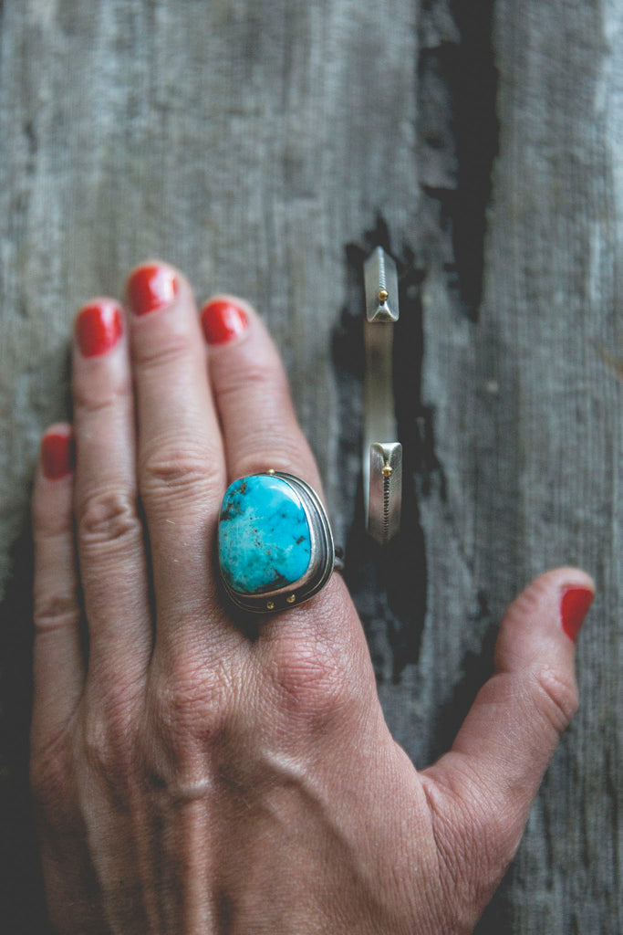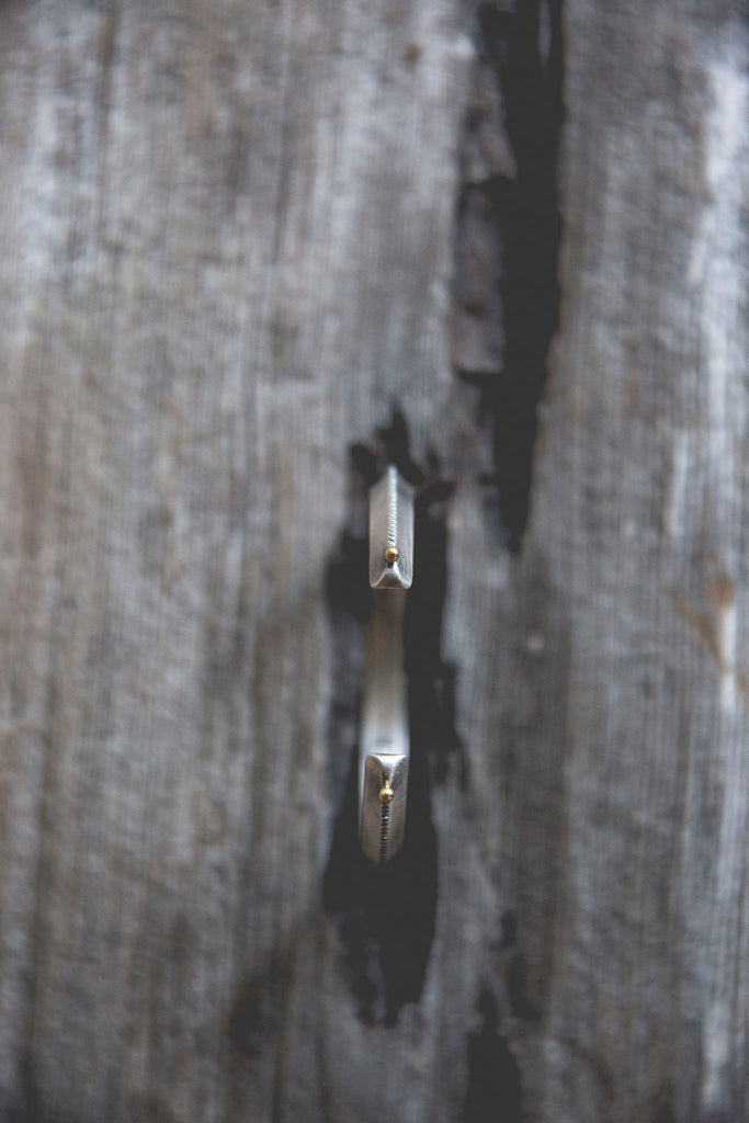 Heavy duty sterling, hand stamped with a bit of texture, festooned with 22K gold details, oxidized, satin finished by hand and lightly burnished. This will be an every day piece you might wear every day of the rest of your life.