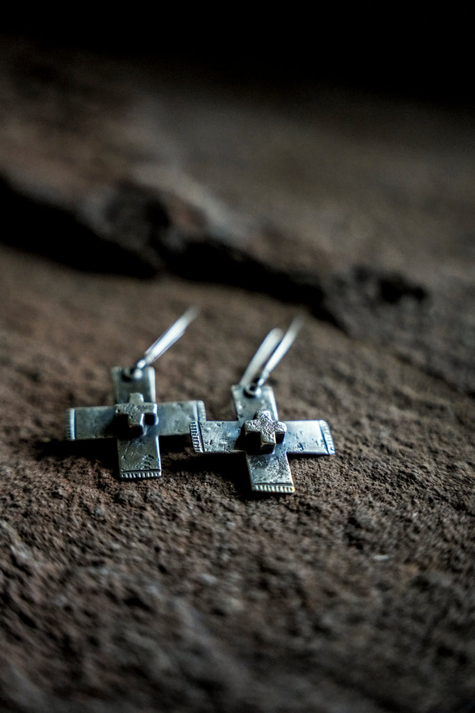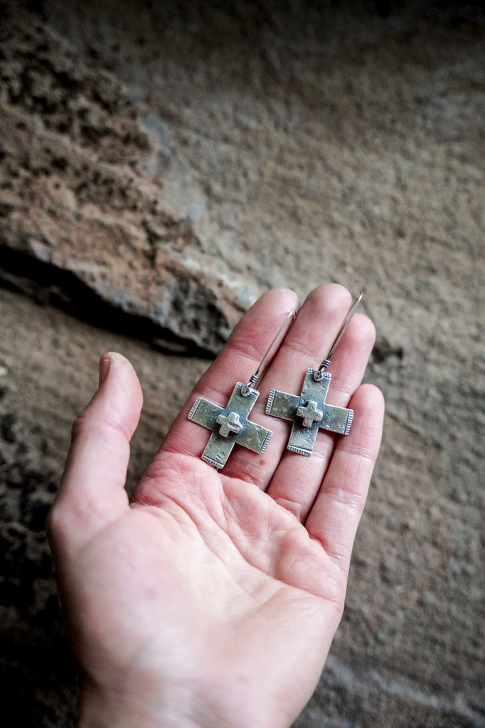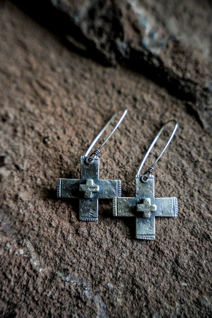 Gritty sterling silver square crosses framed by hand hewn square crosses -- hand stamped and old of soul. It takes a lot of elbow grease to give metal this much texture and character! These earrings are quietly elegant and humble and bright of spirit -- may we all be that way!
