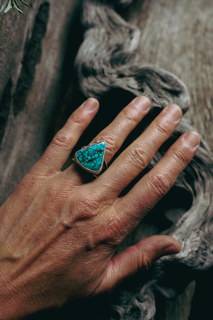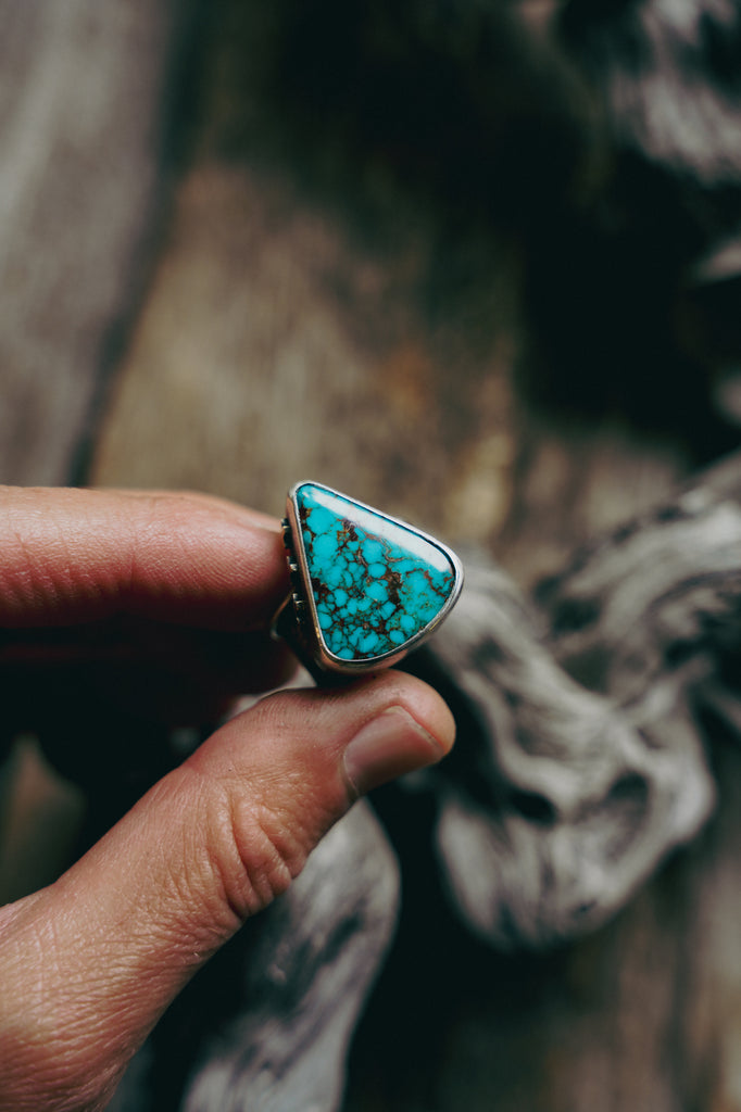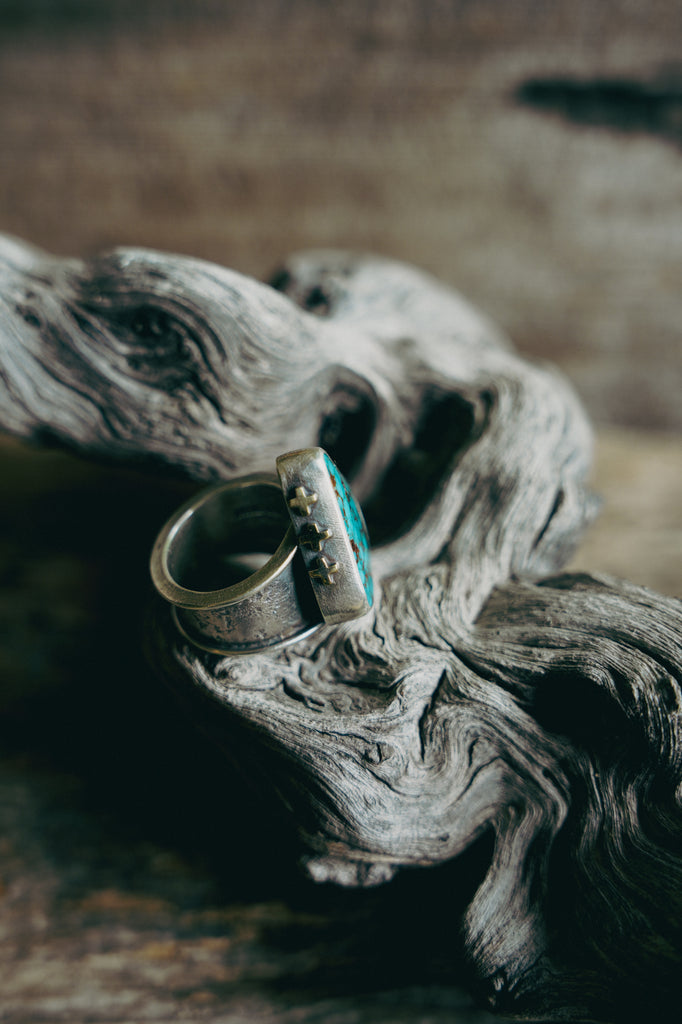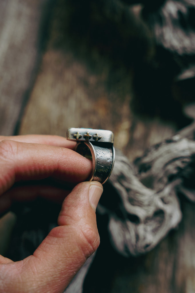 This ring features an EXQUISITE cut of American turquoise, river blue with lovely warm brown matrix. I bought this stone from an old timer who couldn't tell me exactly which mine this material came from, feel free to wager a guess! Simply set, flanked with three white brass crosses and perched atop a wide but tapered band. This ring is awesome. I'd keep it if I could. Elegant and humble and bright of spirit -- may we all be so!