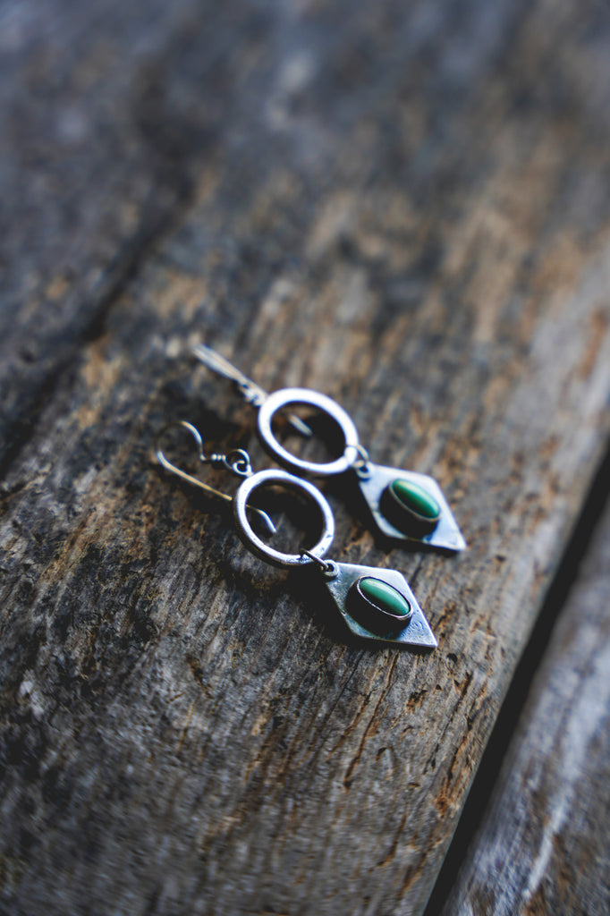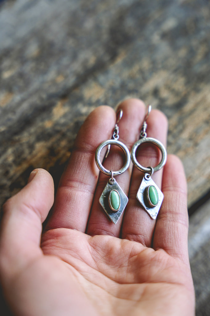 These earrings are intended to be daily drivers for you. They feature a super chunky hoop with a descending diamond. All parts move beautifully and I've used beautiful cuts of sage green Kingman turquoise in the settings.