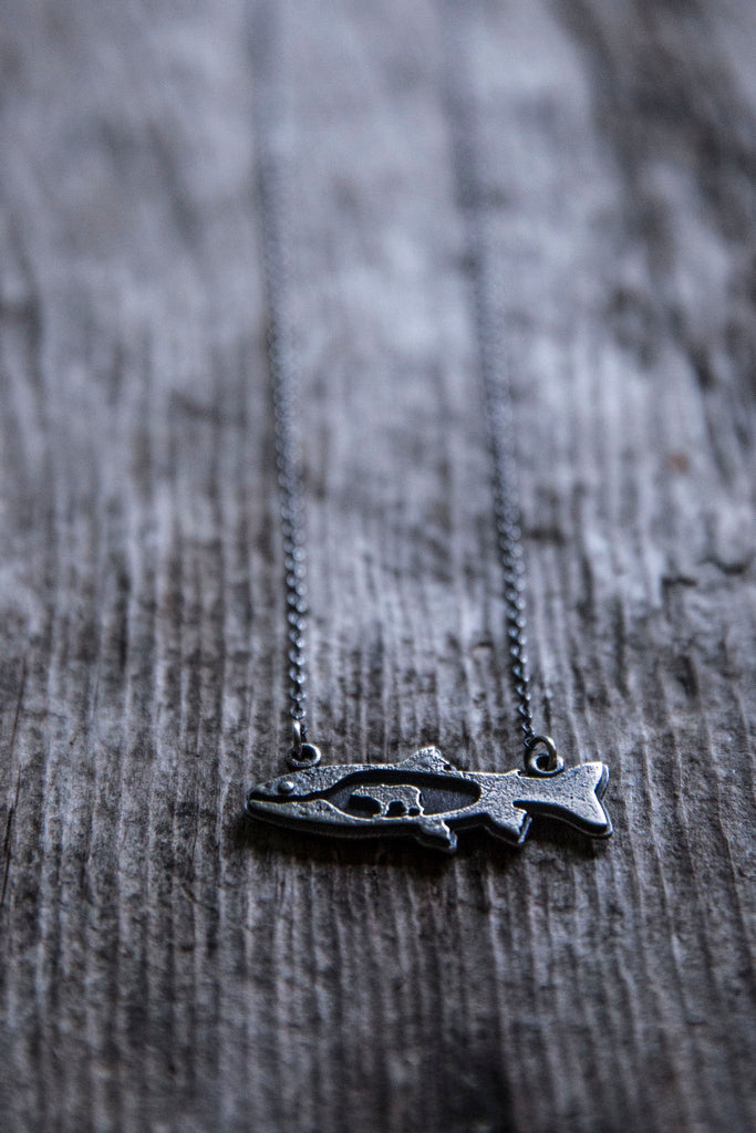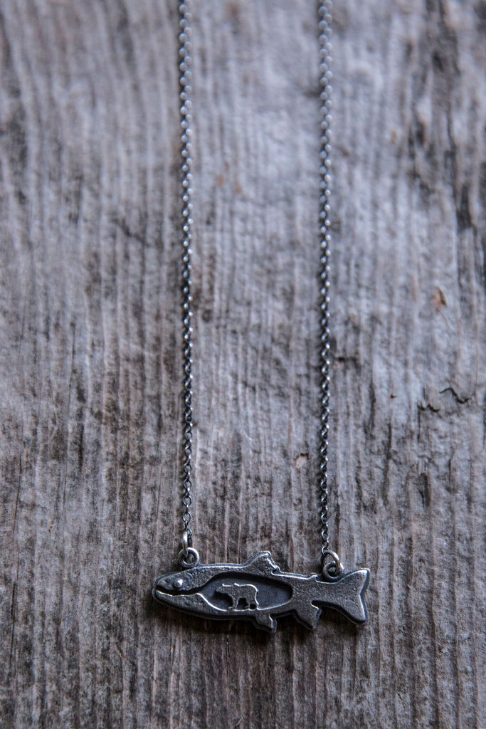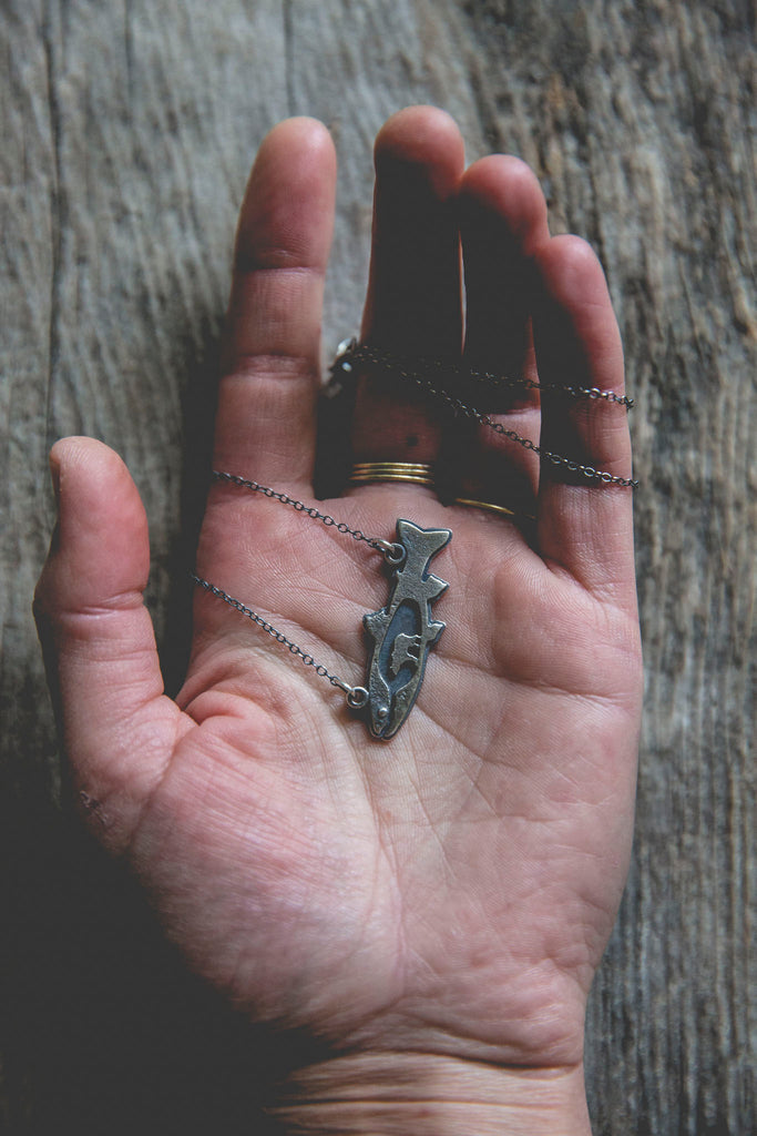 Heavily textured and layered sterling depicting a bear in the belly of trout. A piece to remind you to take heart and to live with courage. You will survive and you will thrive.