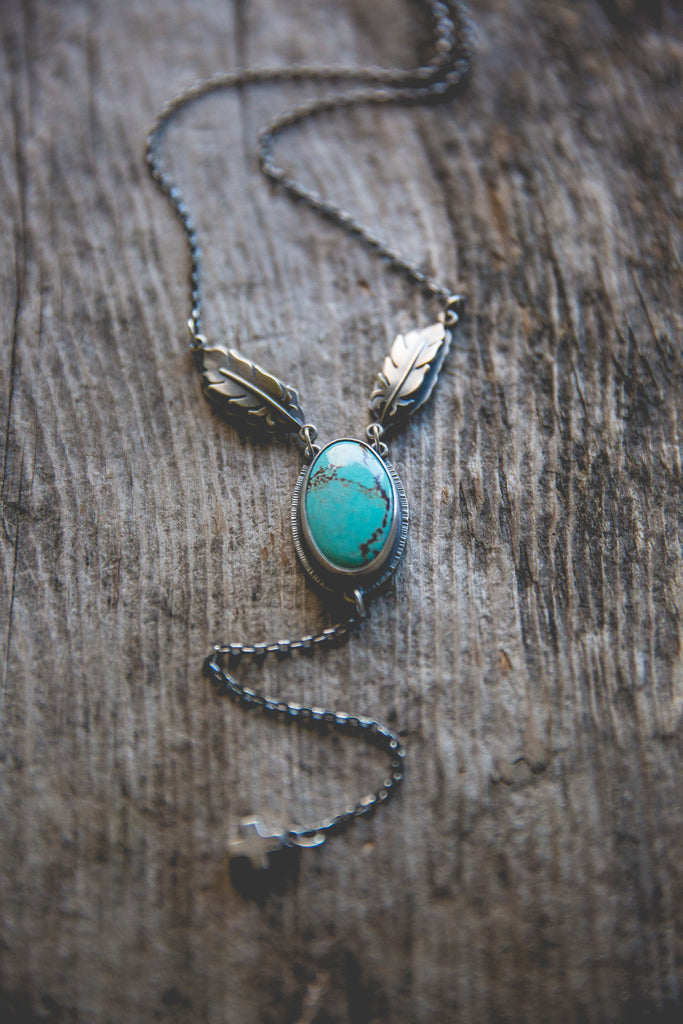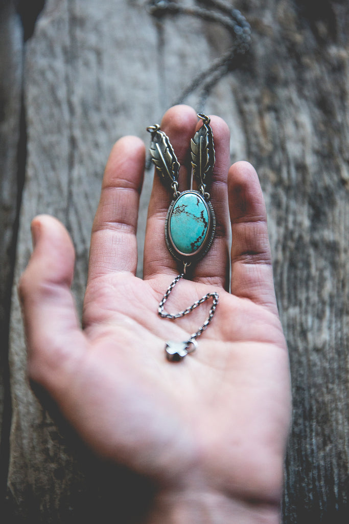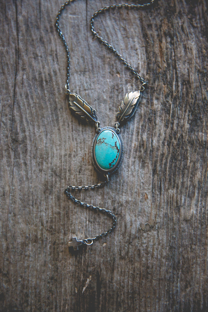 A bright cut of turquoise, suspended by a pair of feathers and anchored by one of my rugged little crosses -- inspired by my life here at my farm along the Snake River and all the beautiful, sad, glorious details that make it. There's something a little holy about this design. I hope you can feel it.