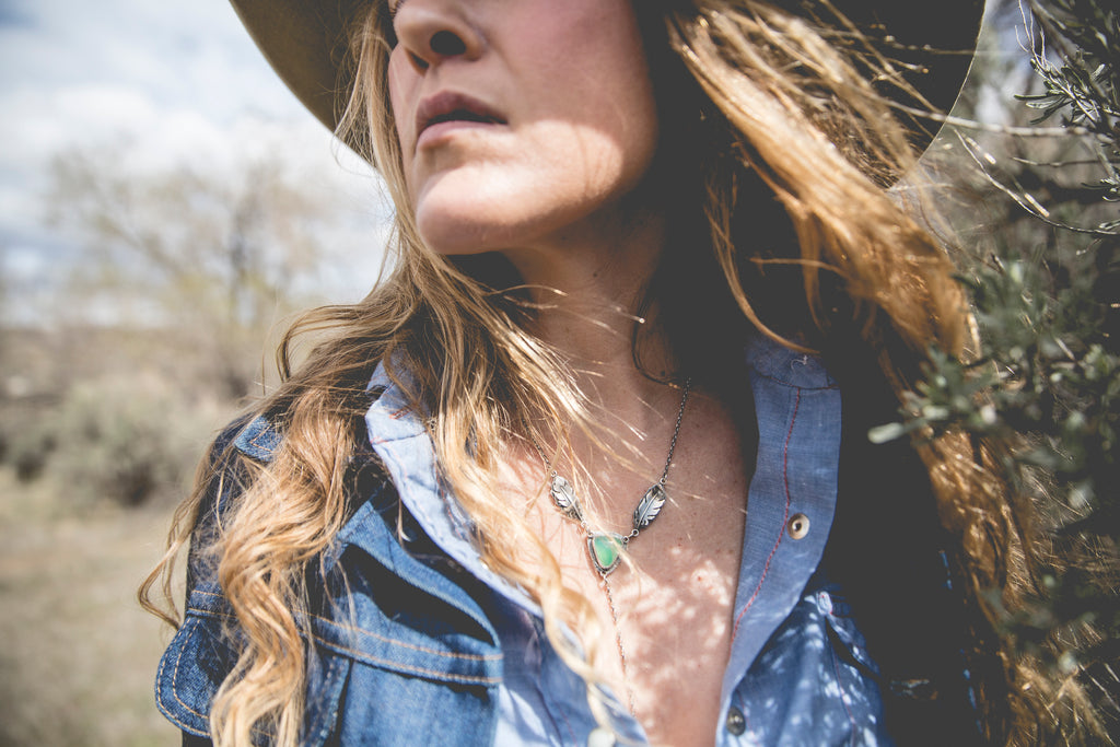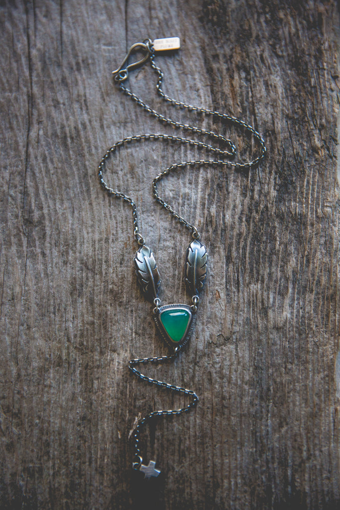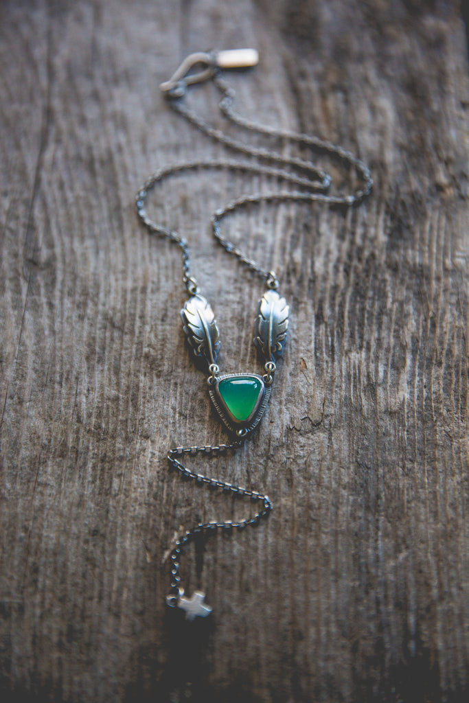 A bright cut of chrysoprase, suspended by a pair of feathers and anchored by one of my rugged little crosses -- inspired by my life here at my farm along the Snake River and all the beautiful, sad, glorious details that make it. There's something a little holy about this design. I hope you can feel it.