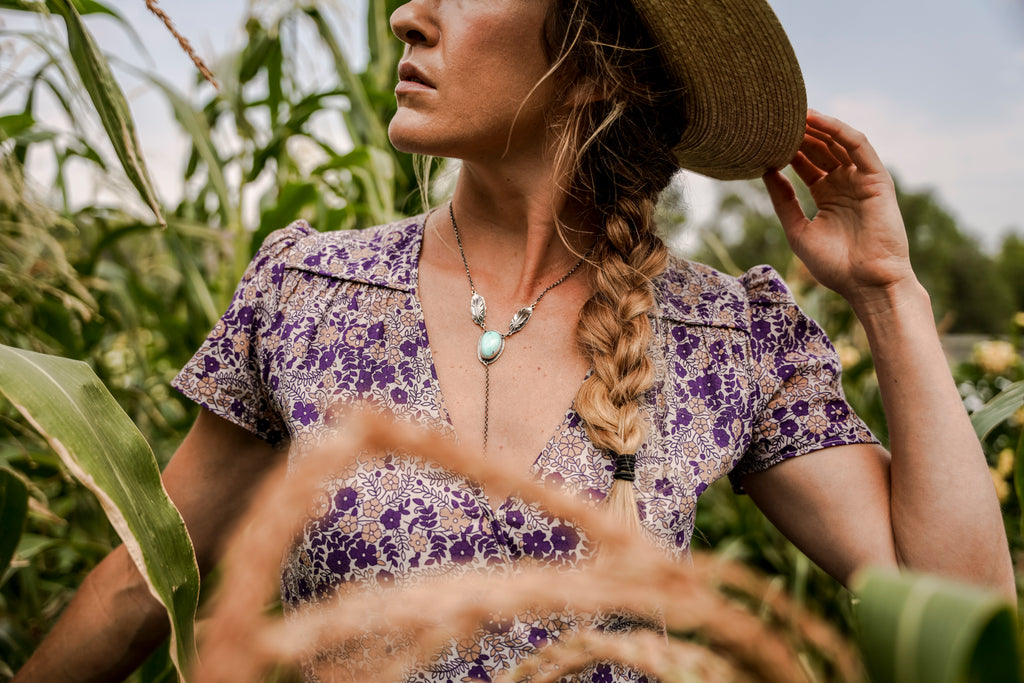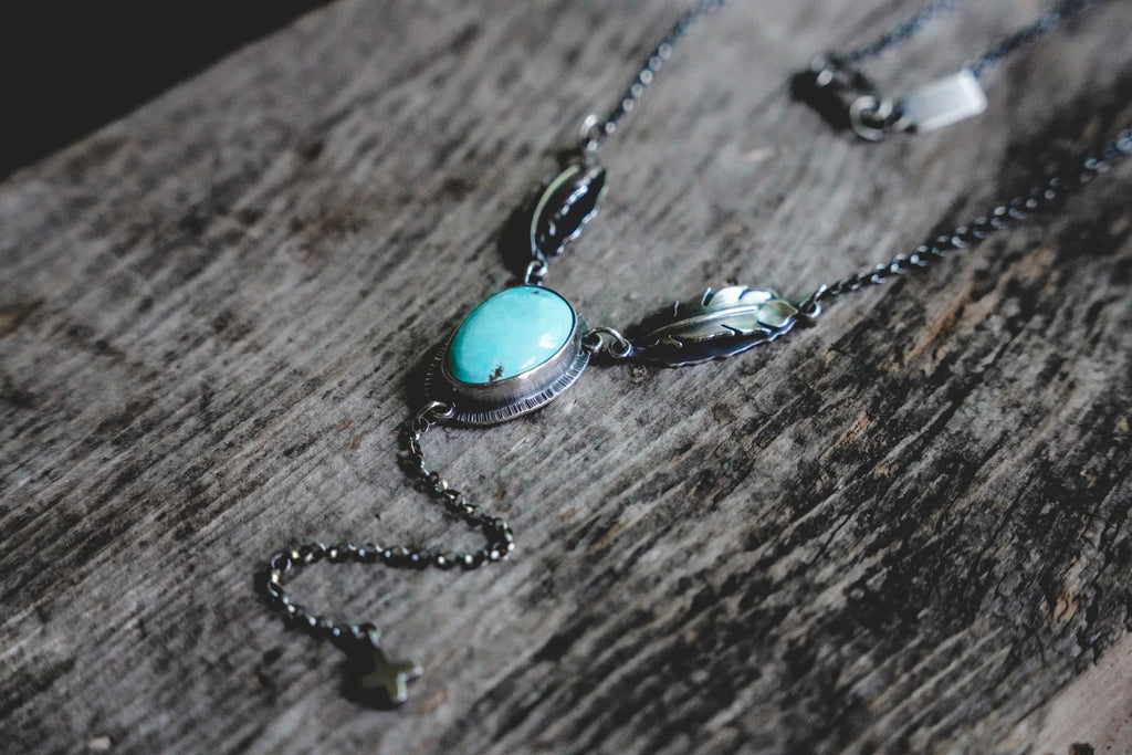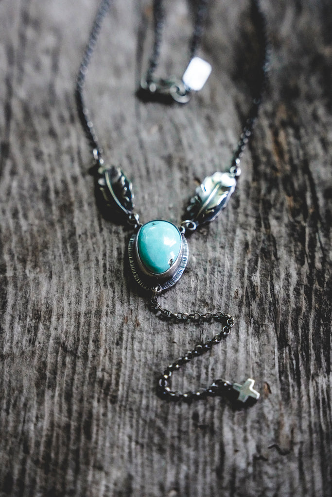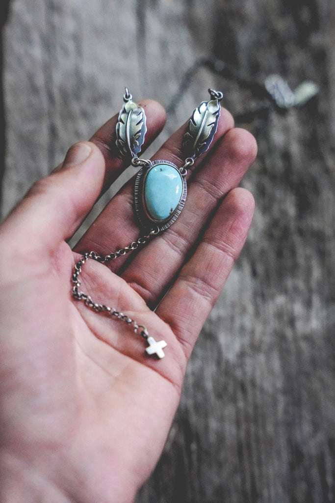 A powerdy blue cut of American turquoise is suspended by a pair of feathers and anchored by one of my rugged little crosses -- inspired by my life here at my farm along the Snake River and all the beautiful, sad, glorious details that make it. There's something a little holy about this design. I hope you can feel it.