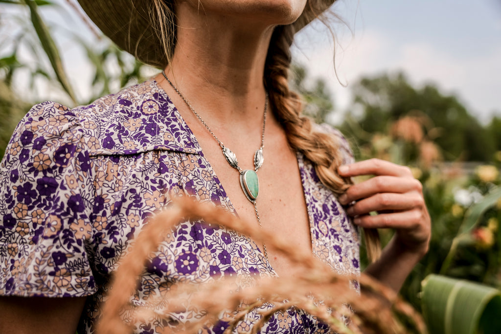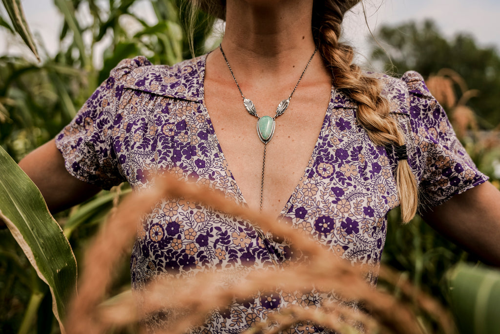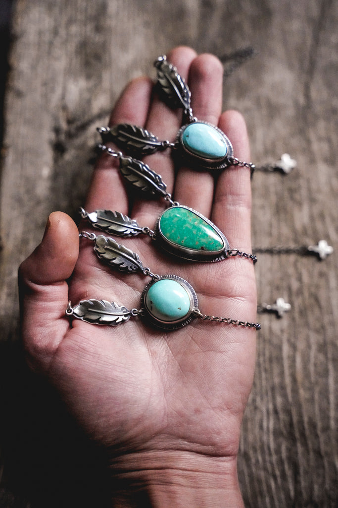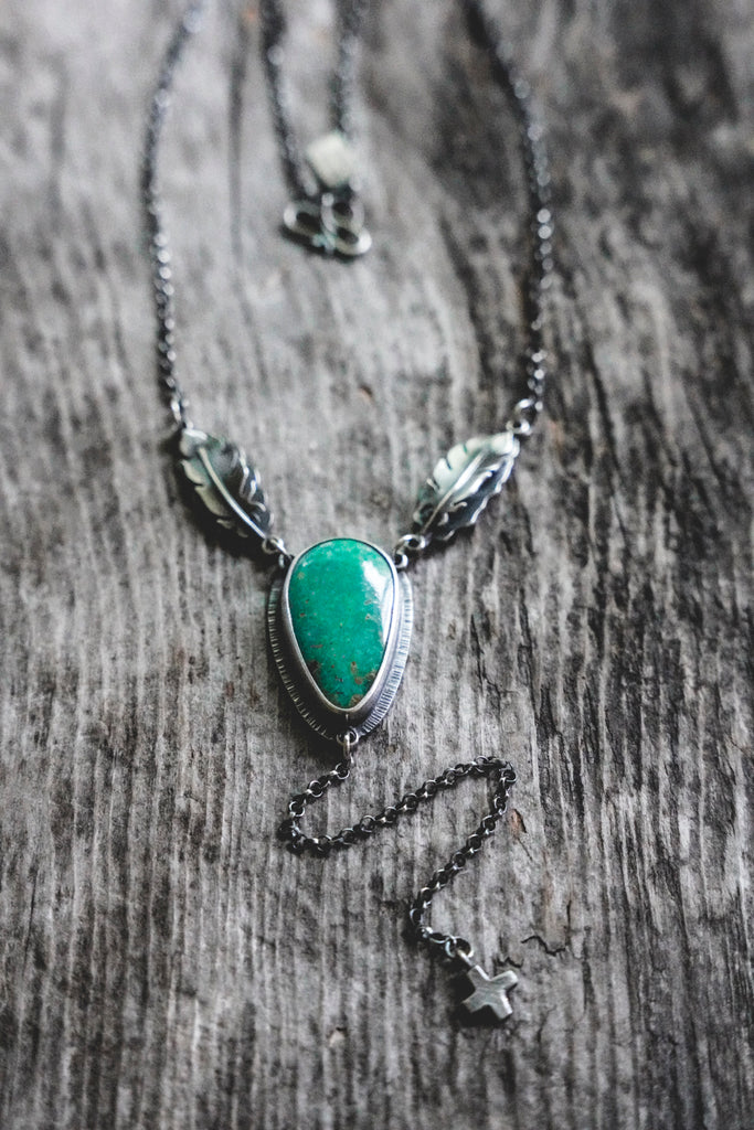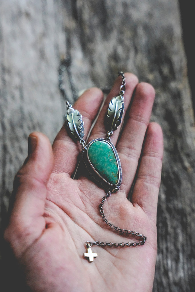 A fresh green cut of American turquoise is suspended by a pair of feathers and anchored by one of my rugged little crosses -- inspired by my life here at my farm along the Snake River and all the beautiful, sad, glorious details that make it. There's something a little holy about this design. I hope you can feel it.