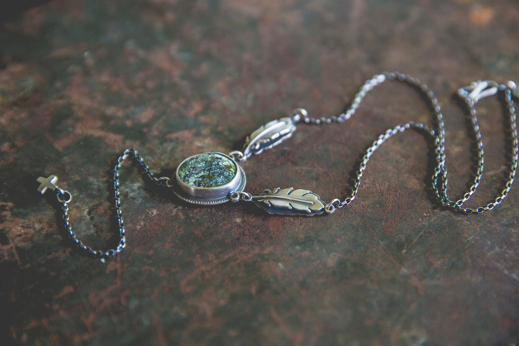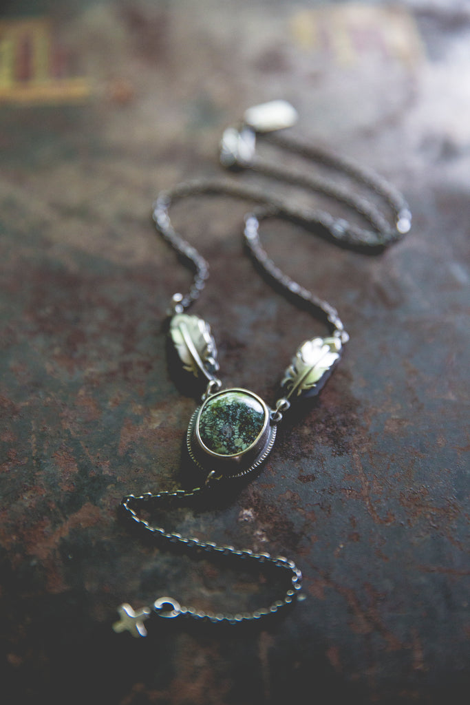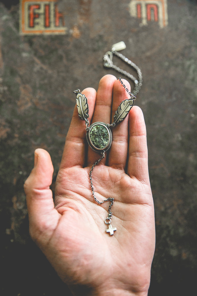 A beautiful cut of Cheyenne variscite suspended between a pair of feathers and anchored by one of my rugged little crosses -- inspired by my life here at my farm along the Snake River and all the beautiful, sad, glorious details that make it. There's something a little holy about this design. I hope you can feel it.