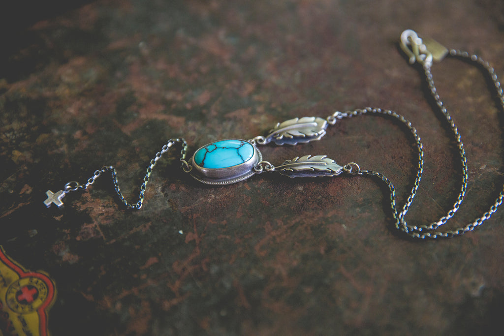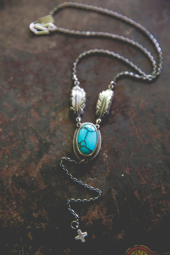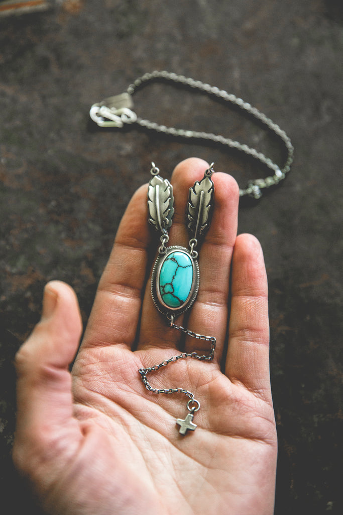 A wonderful cut of Desert Web Turquoise suspended between a pair of feathers and anchored by one of my rugged little crosses -- inspired by my life here at my farm along the Snake River and all the beautiful, sad, glorious details that make it. There's something a little holy about this design. I hope you can feel it.