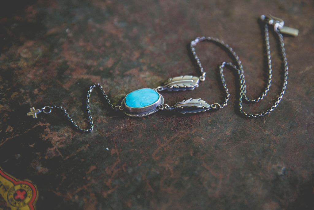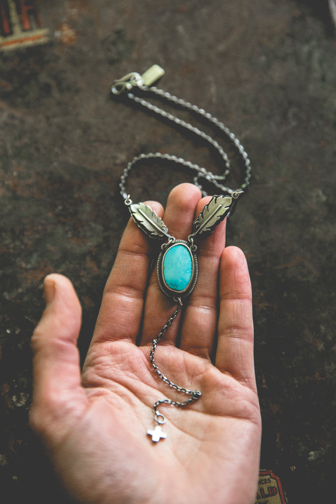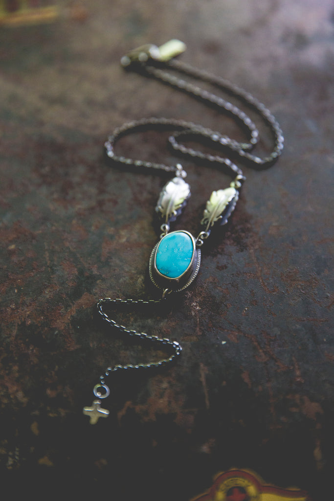 A sky blue cut of Morenci turquoise (THIS STONE IS SUBLIME!!!) suspended between a pair of feathers and anchored by one of my rugged little crosses -- inspired by my life here at my farm along the Snake River and all the beautiful, sad, glorious details that make it. There's something a little holy about this design. I hope you can feel it.