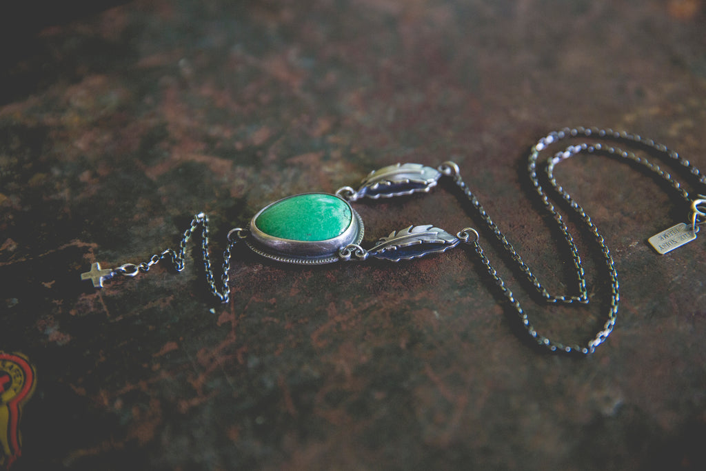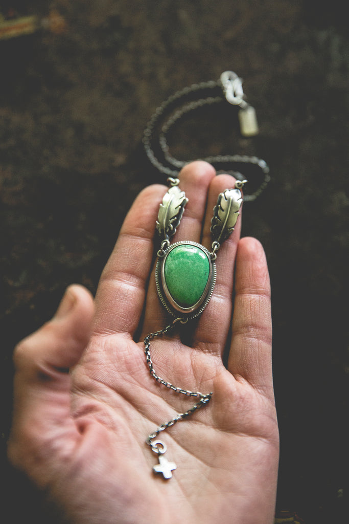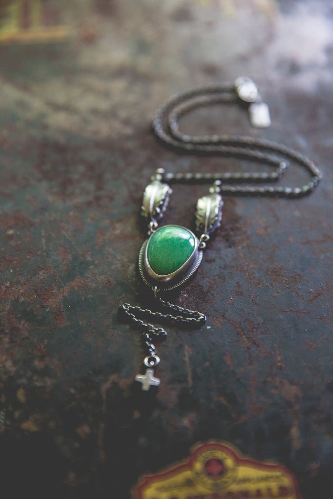 A refreshing cut of bright green variscite suspended between a pair of feathers and anchored by one of my rugged little crosses -- inspired by my life here at my farm along the Snake River and all the beautiful, sad, glorious details that make it. There's something a little holy about this design. I hope you can feel it.
