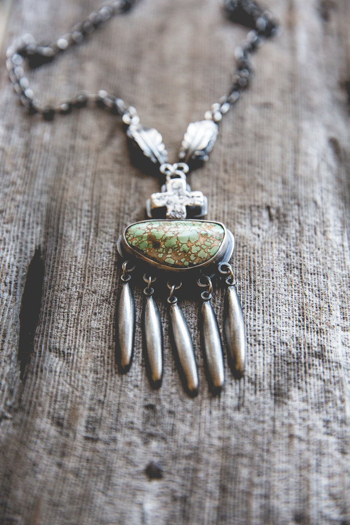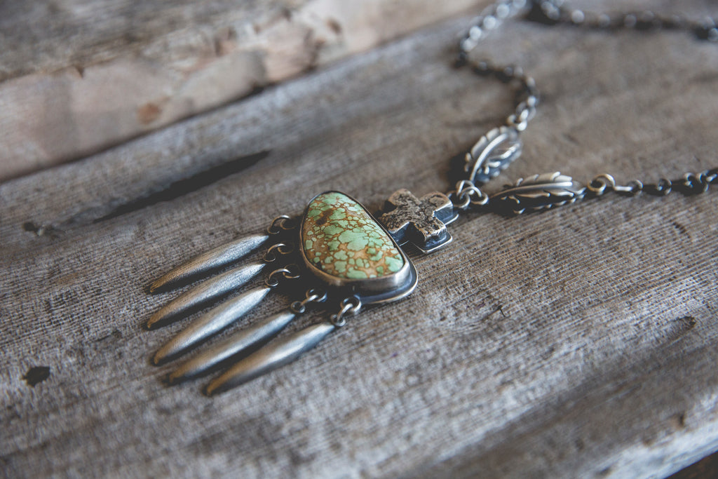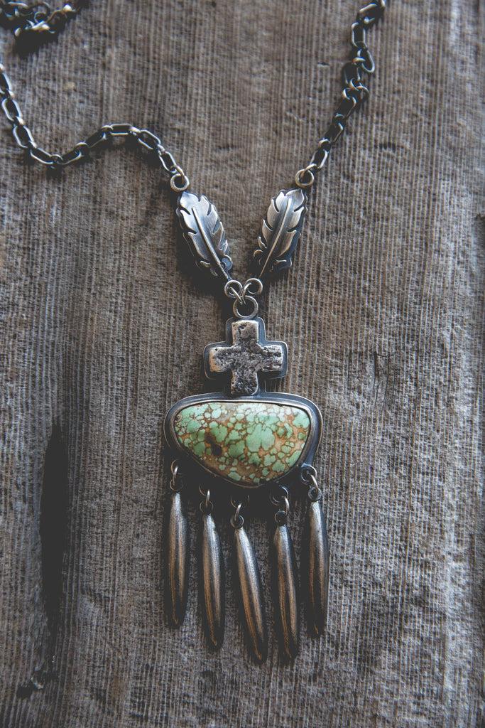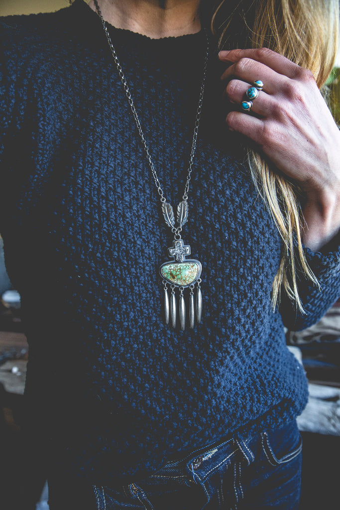 Heavily layered sterling, a flutter of dimensional feathers, a rugged cross, the music of five sterling jingles, and an exquisite cut of American turquoise all suspended from a heavy, adjustable chain -- inspired by my life here at my farm along the Snake River and all the beautiful, sad, glorious details that make it. There's something a little holy about this design. I hope you can feel it.