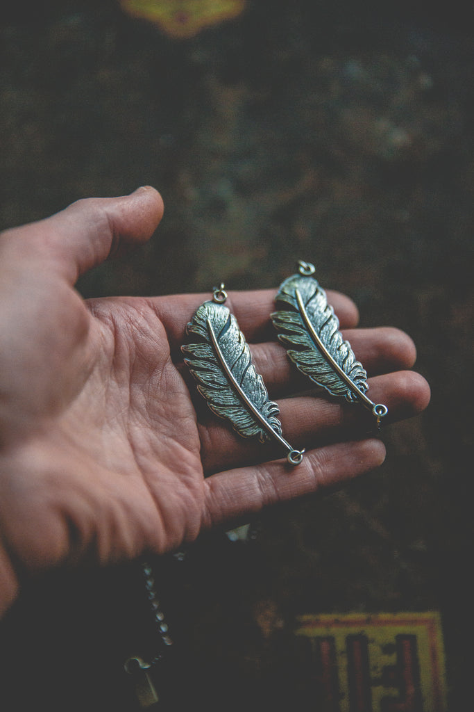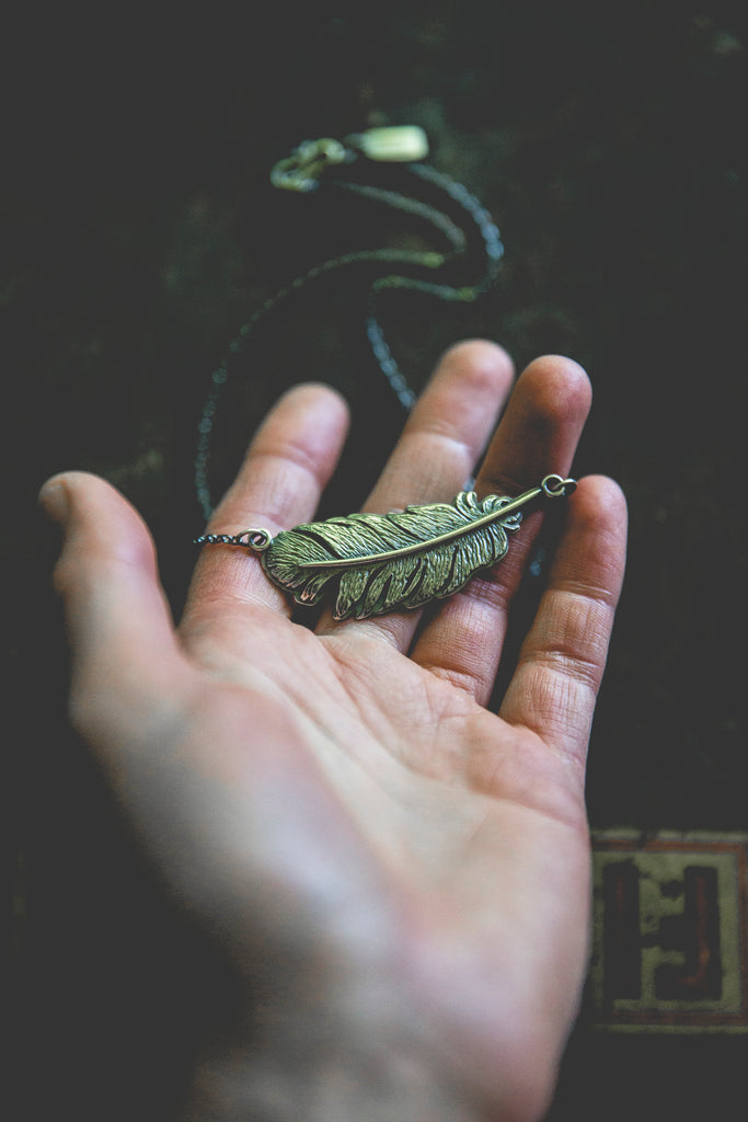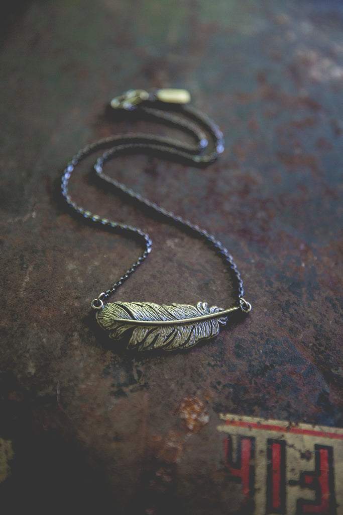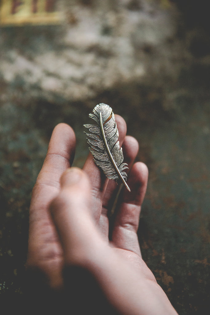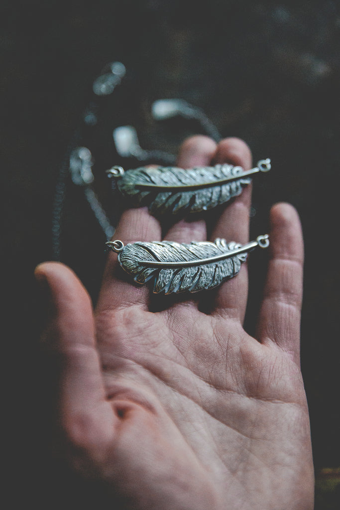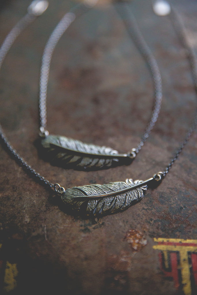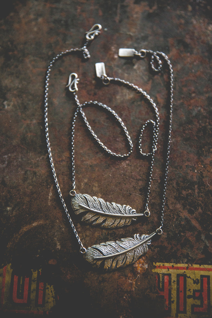 One beautiful, heavy, dimensional, textural, feather built with layers of sterling silver and suspended horizontally at the neckline -- this device is meant to ride the ethers of life with you. Stay light. Let your wings bite the air and take you higher.