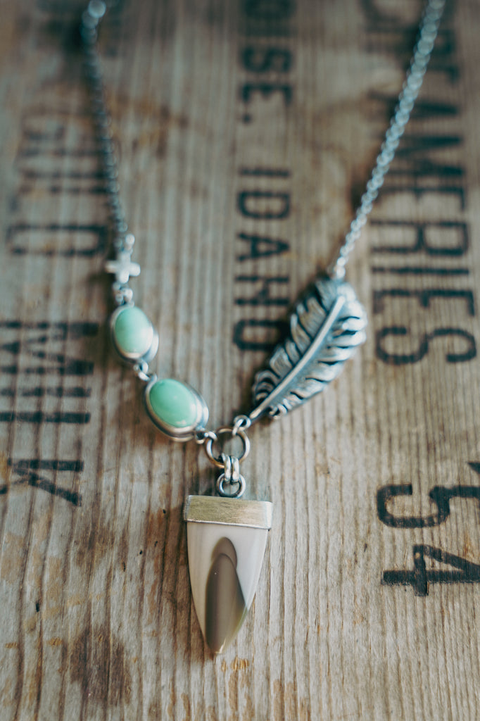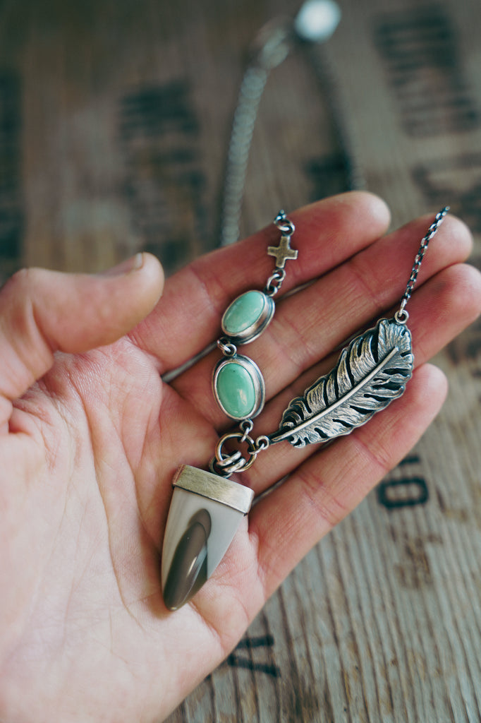One dimensional, textural, feather holds aloft a tongue cut of Imperial Jasper, variscite, turquoise and my square cross -- this device is meant to ride the ethers of life with you. Stay light. Let your wings bite the air and take you higher.