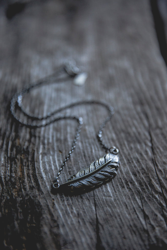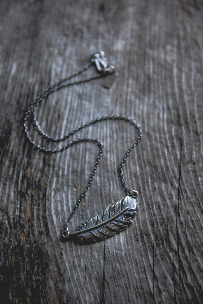 One beautiful, heavy, dimensional, textural, feather built with layers of sterling silver and suspended horizontally at the neckline -- this device is meant to ride the ethers of life with you. Stay light. Let your wings bite the air and take you higher.