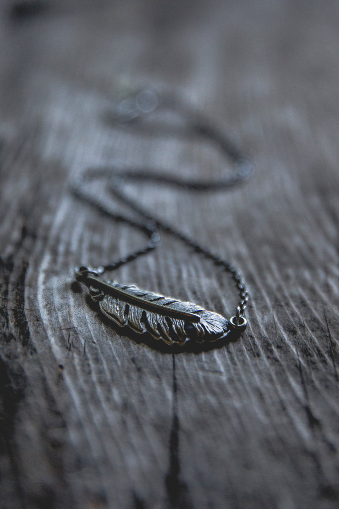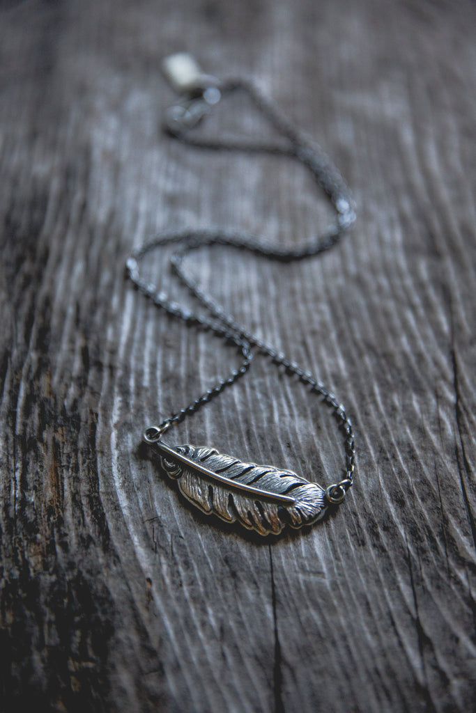 One beautiful, heavy, dimensional, textural, feather built with layers of sterling silver and suspended horizontally at the neckline -- this device is meant to ride the ethers of life with you. Stay light. Let your wings bite the air and take you higher.