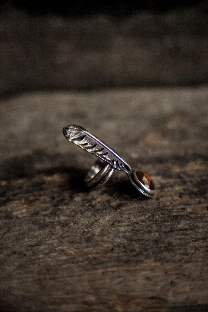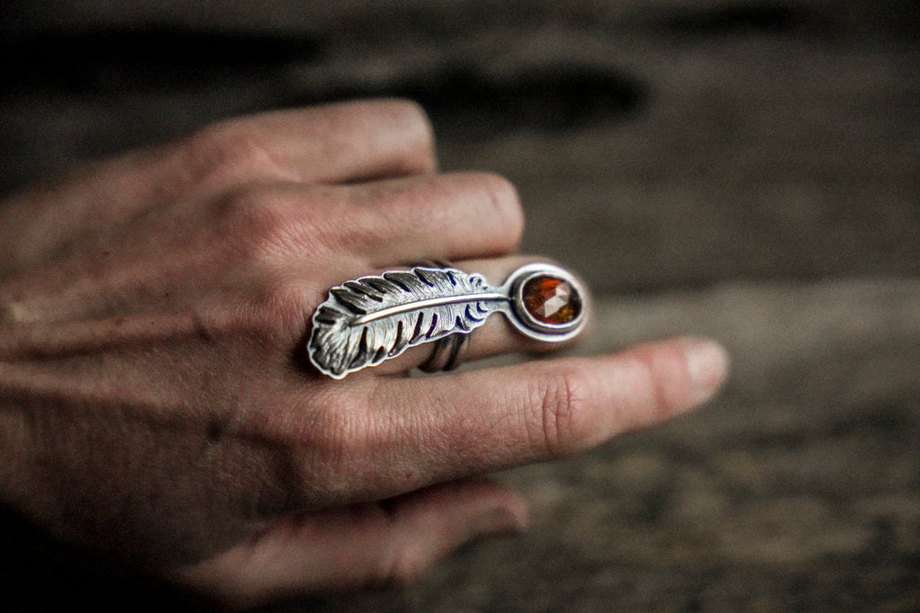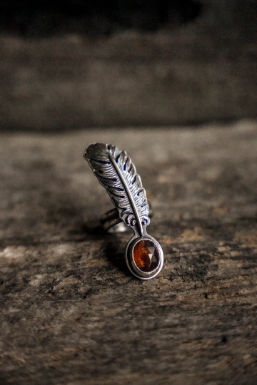 One beautiful, dimensional, textural feather paired with hessonite garnet -- this device is meant to ride the ethers of life with you. Stay light. Let your wings bite the air and take you higher.