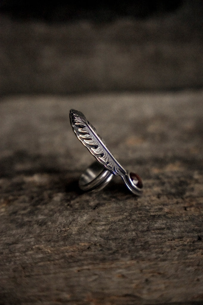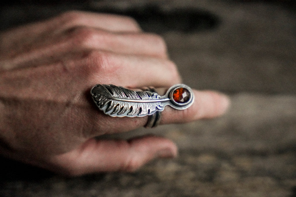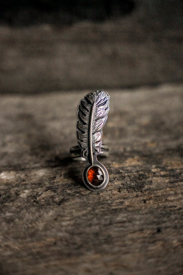 One beautiful, dimensional, textural feather paired with hessonite garnet -- this device is meant to ride the ethers of life with you. Stay light. Let your wings bite the air and take you higher.