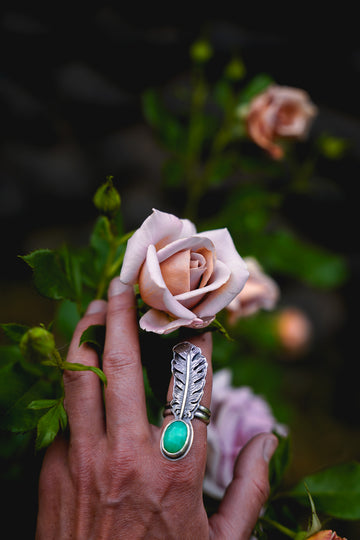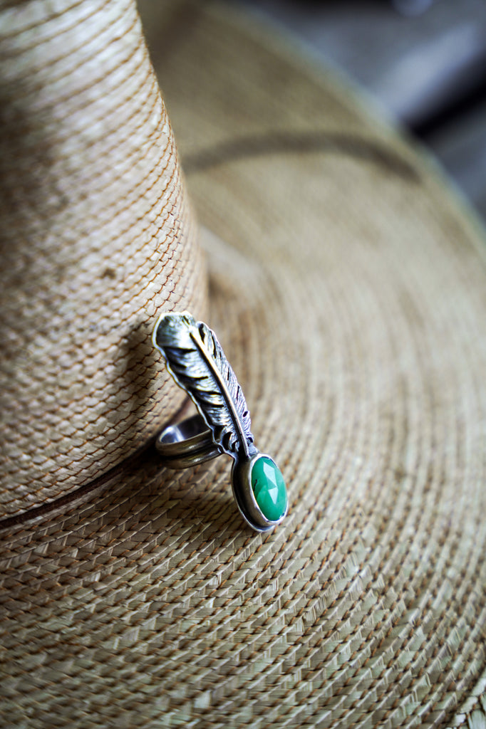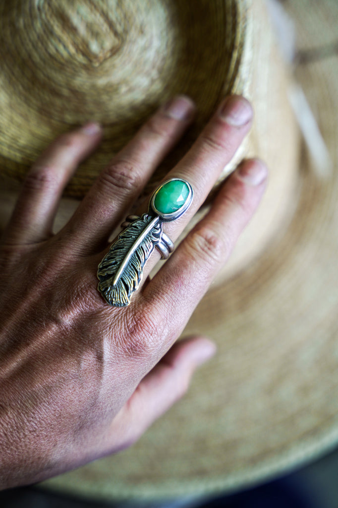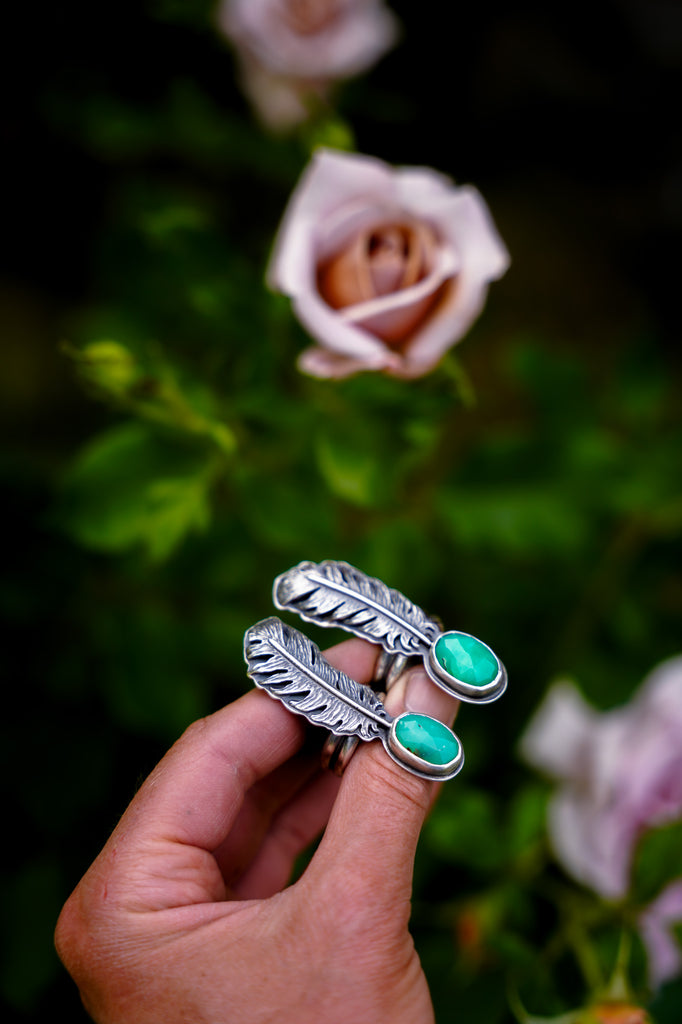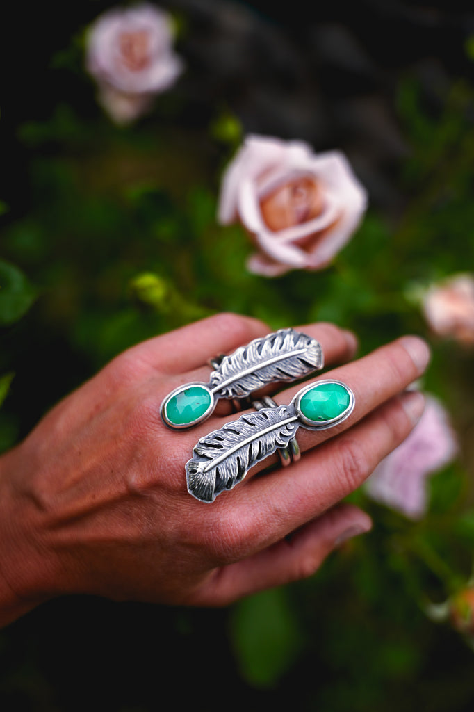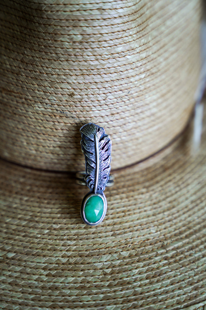 One beautiful, dimensional, textural feather paired with chrysoprase -- this device is meant to ride the ethers of life with you. Stay light. Let your wings bite the air and take you higher.