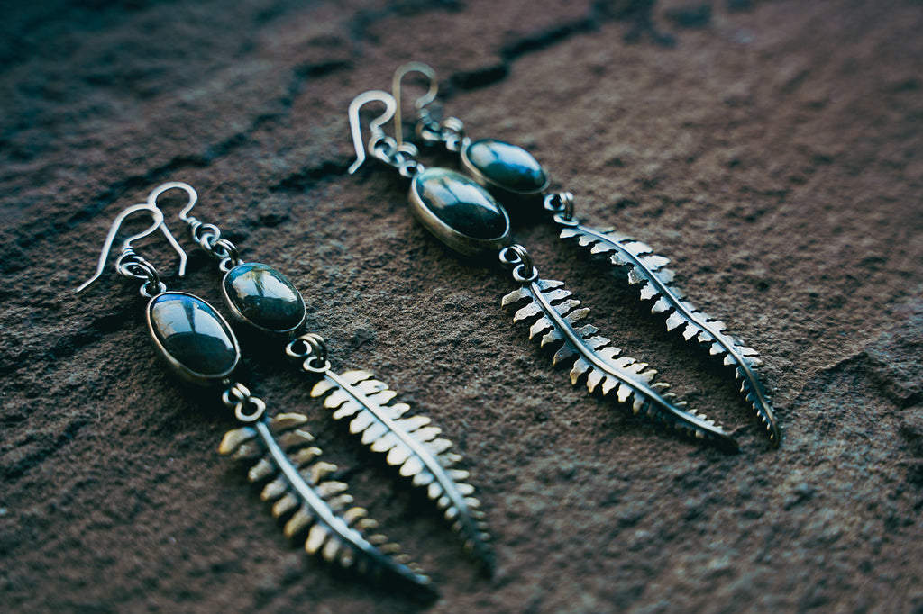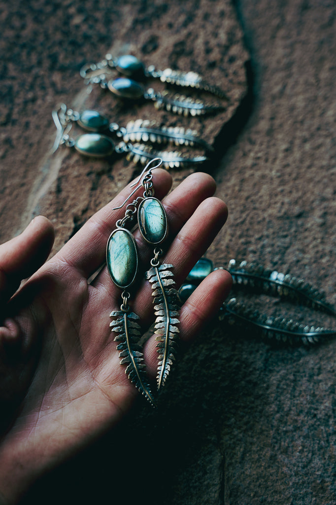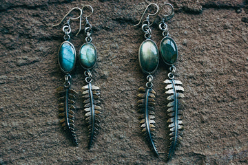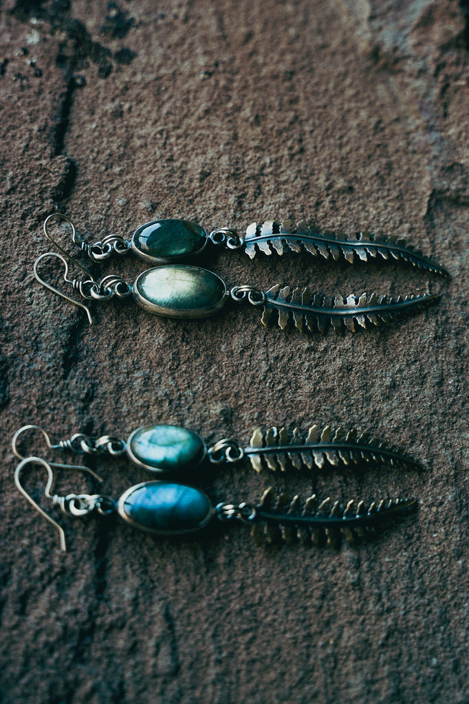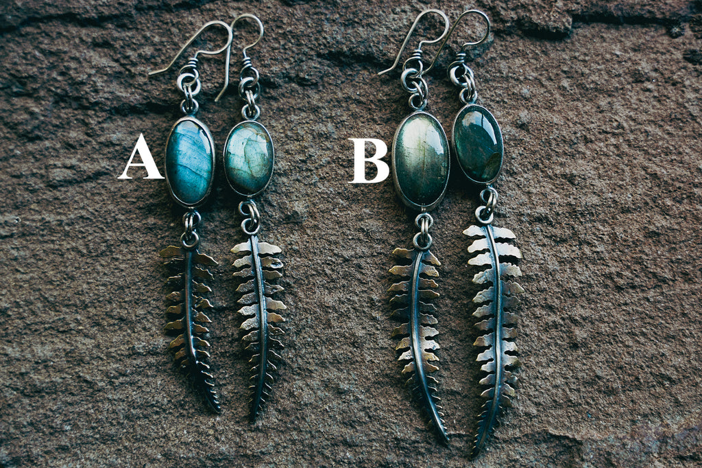 Flashy labradorite paired in approximate rhyme and dimensional ferns in warm brass and sterling silver. Beautiful.