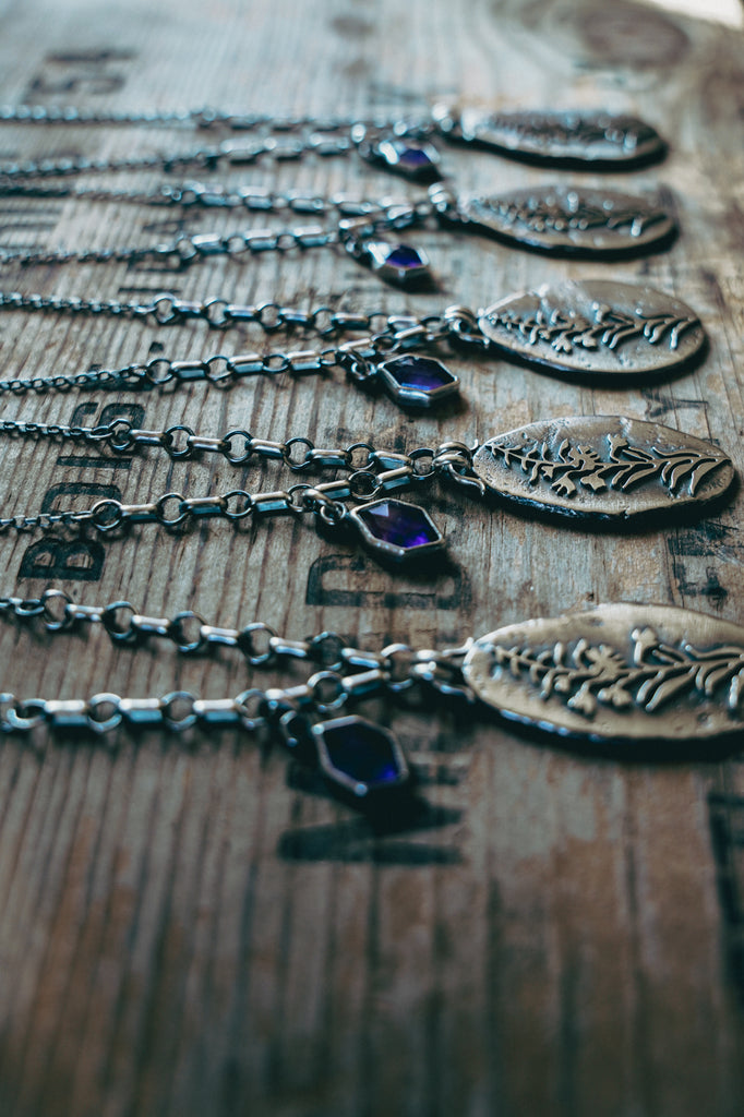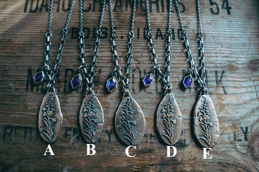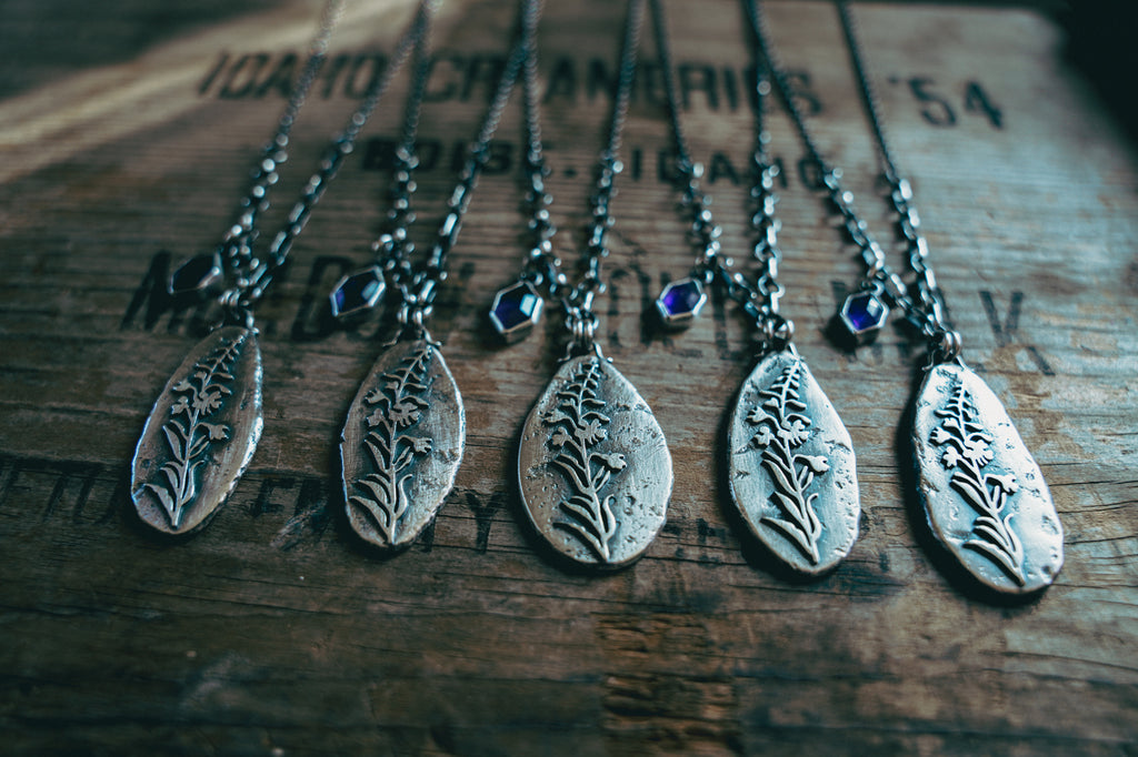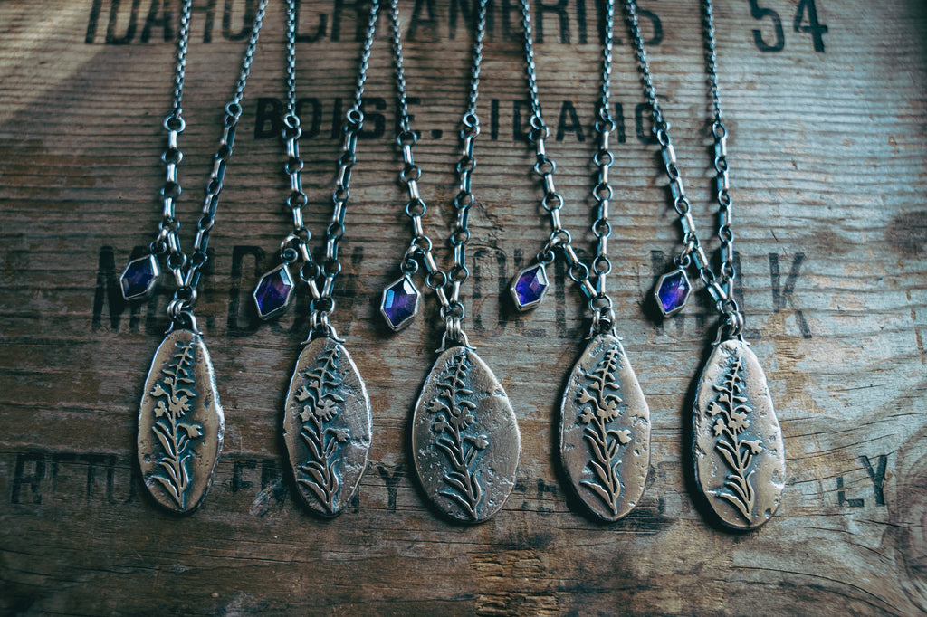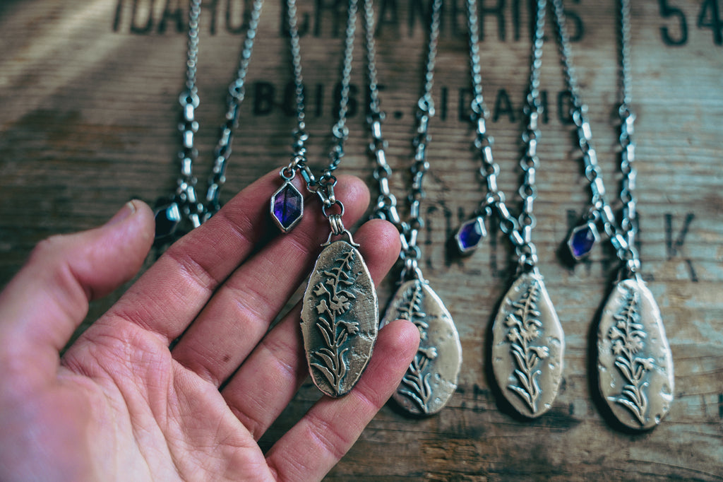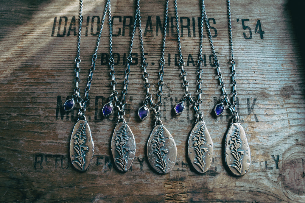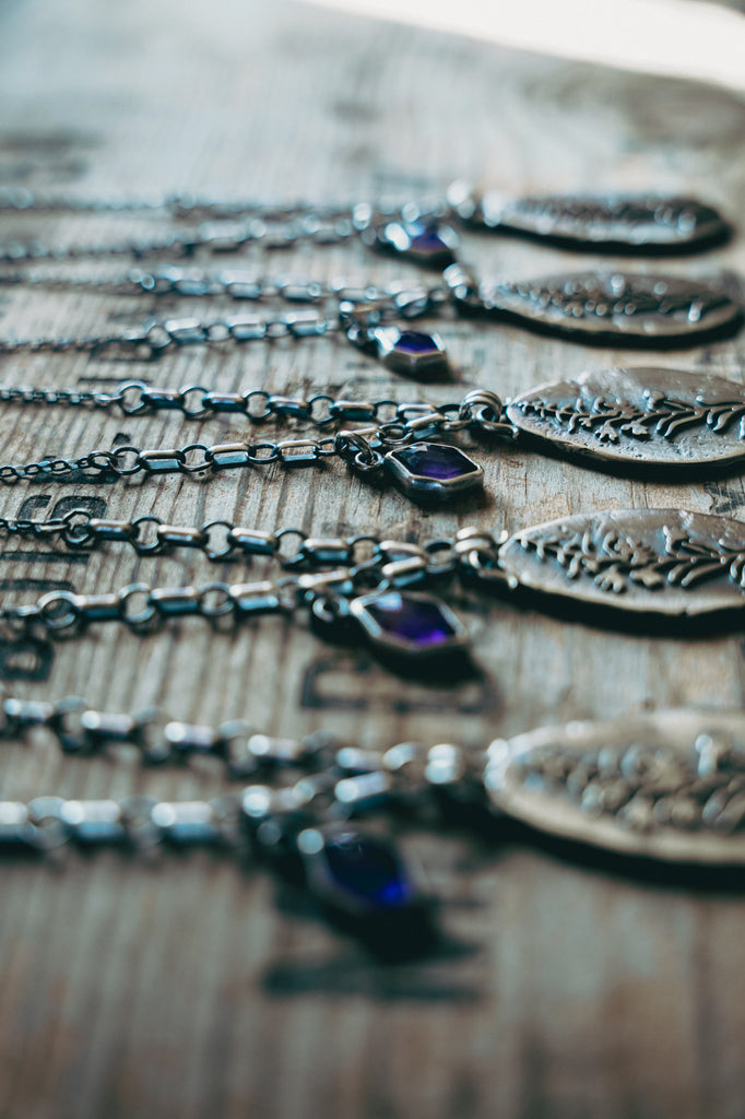 Heavy sterling ingots milled out into beautiful, organic shapes and hand textured to resemble the granite talus slopes of the high country. Fireweed silhouettes hand pierced from sterling sheet. Twinkling amethysts. Combination chains. Sterling silver with a bronze accent at the clasp.