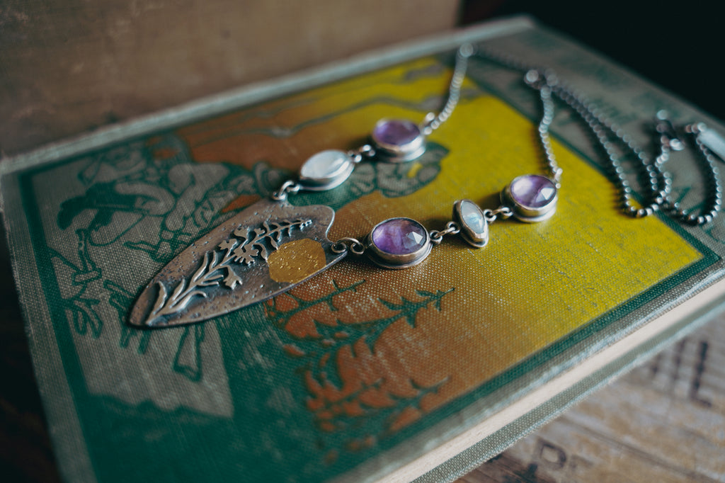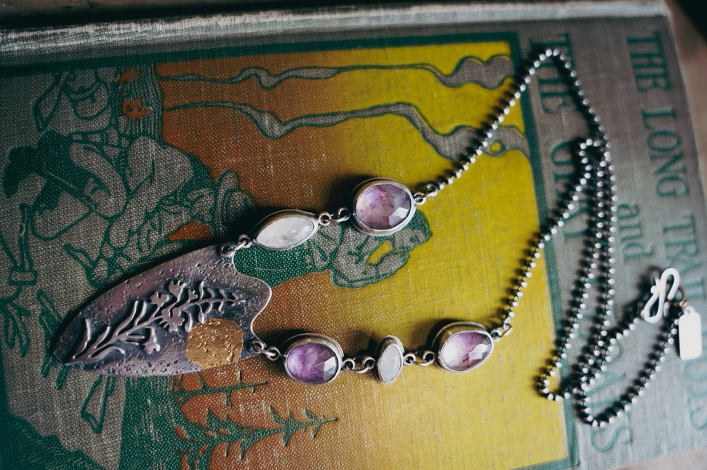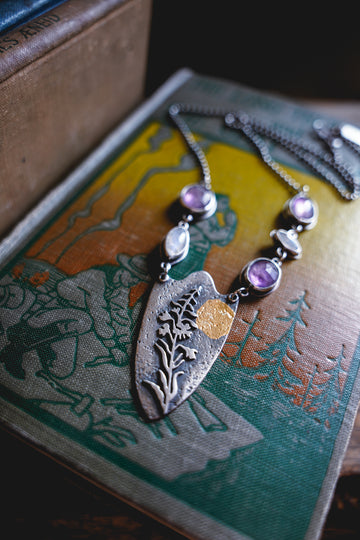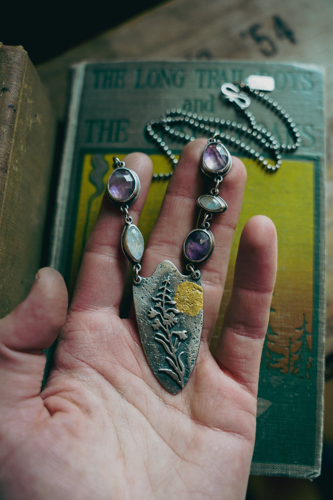 A one of a kind interpretation of my fireweed motif featuring a spangling of amethysts and moonstones and a smudge of 23K gold that looks a lot like a full moon rising over the high country. If the wildest place can recover from a deep burn, you can too.