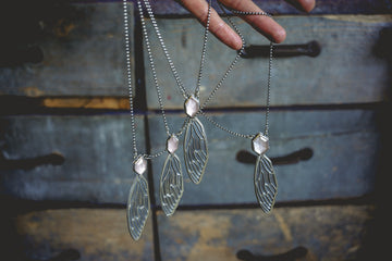 These pendants are quite big and feature pierced cicada wings paired with faceted cuts of rose quartz -- the result is pretty magical.