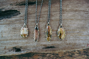 These necklaces are made of four earthy, woodsy cuts of Morrisonite Jasper, textural sterling silver and jeweler's brass.