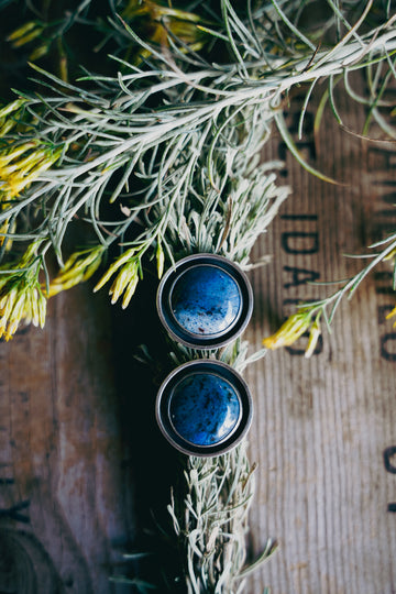 Clean, burly, sterling silver settings for round cuts of a stone I really love -- dumortierite -- which comes in beautiful shades of washed denim. Sometimes mistaken for lapis, this stone has the look of your favorite pair of jeans. Soft and beloved and friendly.