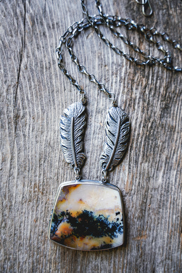 Fabricated, dimensional, textural, sterling silver feathers hold an enormous cut of Snake River Dendritic Agate aloft. An heirloom piece inspired by Idaho and my life here on the Snake River. Heavy. Ornate. Earthy. Natural. One of a kind.