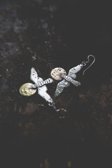 The moment when a hawk passes between me and the sun and casts a fast shadow down upon the sagebrush sea. It happens to me all the time when I’m out riding my horses and it always makes my breath catch in my throat. I've tried to create that hawk shadow in sterling silver and brass here and the result is beautiful and whimsical with a nod to folkart. Love them!