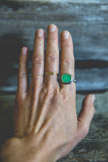 I've set this collection of chrysoprase simply with my usual amount of grit and texture (I like things to look like they've lived through a couple of generations of women before making their way to you). The stones themselves are all freeform cuts making each ring unique. Rugged yet simple bands seal the deal with these rings.