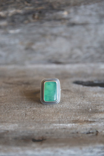 I've set this collection of chrysoprase simply with my usual amount of grit and texture (I like things to look like they've lived through a couple of generations of women before making their way to you). The stones themselves are all freeform cuts making each ring unique. Rugged yet simple bands seal the deal with these simple designs.