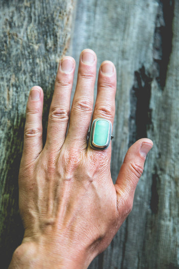 I've set this collection of chrysoprase simply with my usual amount of grit and texture (I like things to look like they've lived through a couple of generations of women before making their way to you). The stones themselves are all freeform cuts making each ring unique. Rugged yet simple bands seal the deal with these rings.