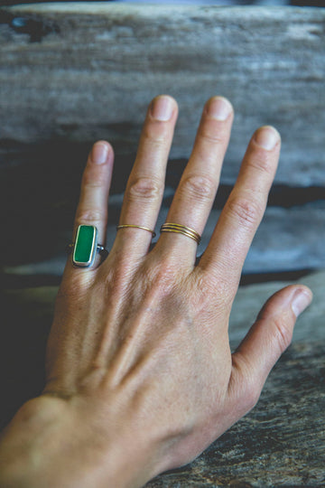 I've set this collection of chrysoprase simply with my usual amount of grit and texture (I like things to look like they've lived through a couple of generations of women before making their way to you). The stones themselves are all freeform cuts making each ring unique. Rugged yet simple bands seal the deal with these rings.