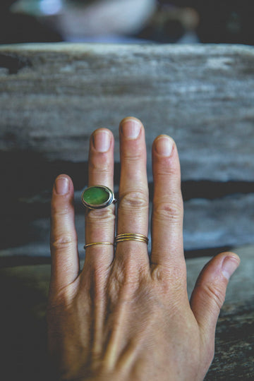 I've set this collection of chrysoprase simply with my usual amount of grit and texture (I like things to look like they've lived through a couple of generations of women before making their way to you). The stones themselves are all freeform cuts making each ring unique. Rugged yet simple bands seal the deal with these rings.
