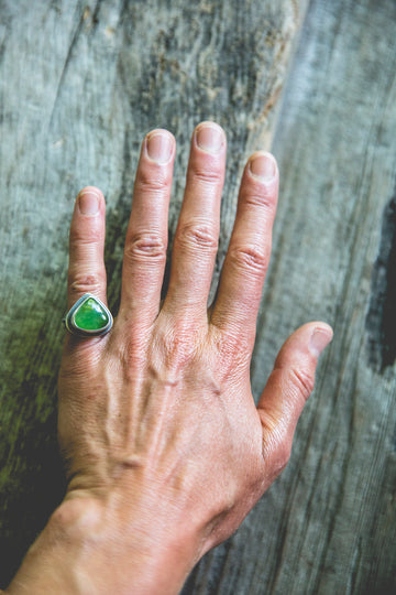 I've set this collection of chrysoprase simply with my usual amount of grit and texture (I like things to look like they've lived through a couple of generations of women before making their way to you). The stones themselves are all freeform cuts making each ring unique. Rugged yet simple bands seal the deal with these rings.