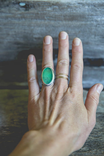 I've set this collection of chrysoprase simply with my usual amount of grit and texture (I like things to look like they've lived through a couple of generations of women before making their way to you). The stones themselves are all freeform cuts making each ring unique. Rugged yet simple bands seal the deal with these rings.