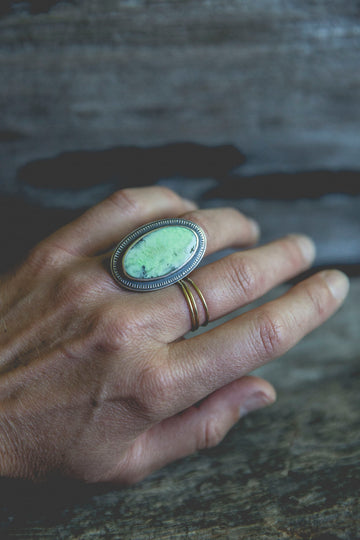 I've set this gorgeous, textural cut of chrysoprase in a heavier setting, hand stamped and textured and paired with a beautiful, fabricated band. This setting has a really beautiful, old-timey, Spanish feel to it and the stone is ultra-fresh. Just gorgeous!