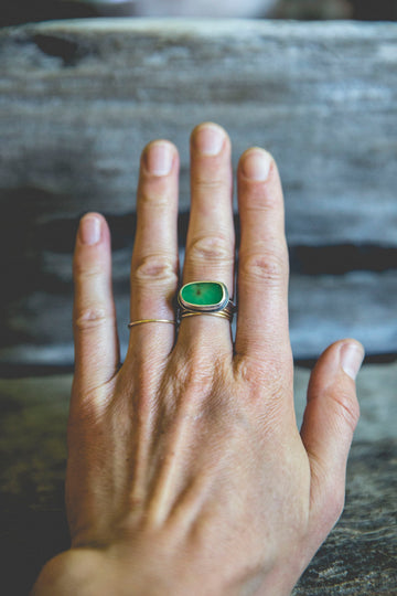 I've set this collection of chrysoprase simply with my usual amount of grit and texture (I like things to look like they've lived through a couple of generations of women before making their way to you). The stones themselves are all freeform cuts making each ring unique. Rugged yet simple bands seal the deal with these rings.