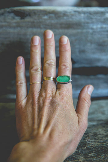 I've set this collection of chrysoprase simply with my usual amount of grit and texture (I like things to look like they've lived through a couple of generations of women before making their way to you). The stones themselves are all freeform cuts making each ring unique. Rugged yet simple bands seal the deal with these rings.