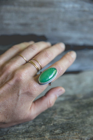 I've set this collection of chrysoprase simply with my usual amount of grit and texture (I like things to look like they've lived through a couple of generations of women before making their way to you). The stones themselves are all freeform cuts making each ring unique. Rugged yet simple bands seal the deal with these rings.