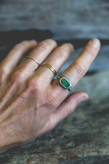 I've set this collection of chrysoprase simply with my usual amount of grit and texture (I like things to look like they've lived through a couple of generations of women before making their way to you). The stones themselves are all freeform cuts making each ring unique. Rugged yet simple bands seal the deal with these rings.