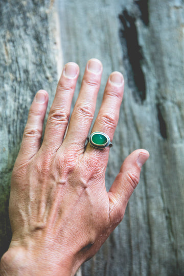I've set this collection of chrysoprase simply with my usual amount of grit and texture (I like things to look like they've lived through a couple of generations of women before making their way to you). The stones themselves are all freeform cuts making each ring unique. Rugged yet simple bands seal the deal with these rings.