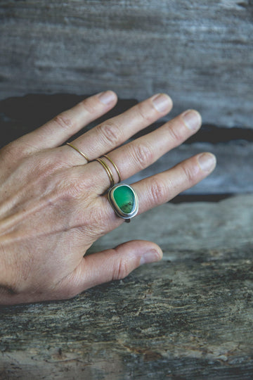 I've set this collection of chrysoprase simply with my usual amount of grit and texture (I like things to look like they've lived through a couple of generations of women before making their way to you). The stones themselves are all freeform cuts making each ring unique. Rugged yet simple bands seal the deal with these rings.