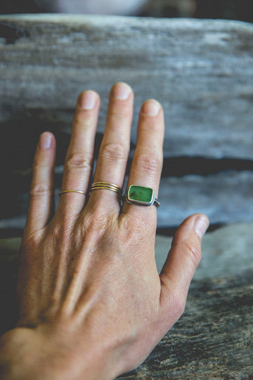 I've set this collection of chrysoprase simply with my usual amount of grit and texture (I like things to look like they've lived through a couple of generations of women before making their way to you). The stones themselves are all freeform cuts making each ring unique. Rugged yet simple bands seal the deal with these rings.