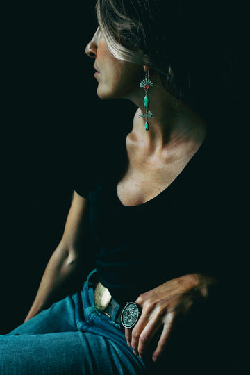 Carnelian sunbursts, chrysoprase in approximate rhyme and jackrabbits, of course!!! Lots of tiny tiny work goes into this earring design and the result is earthy and peaceful -- born of wide open spaces and stillness.