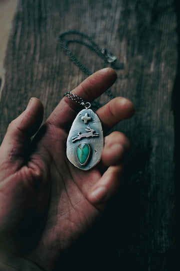 I have loved starting a new year of work with these jackrabbits! They are too much fun to make. I have paired this jackrabbit with Kingman turquoise atop a heavy, milled ingot that is rugged with texture and organic in form. This necklace has a really lovely heft and presence. I hope it becomes a touchstone piece for its wearer -- an earthy, peaceful necklace born of wide open spaces and stillness.